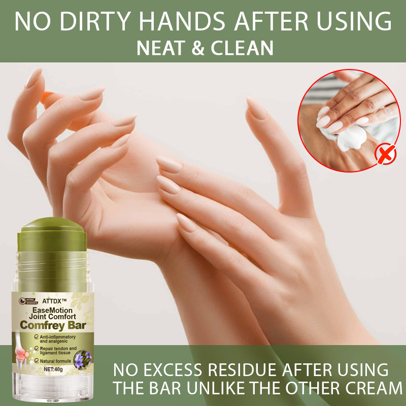 ATTDX™ EaseMotion Joint Comfort Comfrey Bar features a natural herbal ingredient formula designed to deliver effective joint relief. Its easy-to-apply design ensures a clean application process, leaving no mess or residue on your hands. Enjoy the convenience of targeted relief without the hassle of traditional creams or ointments.