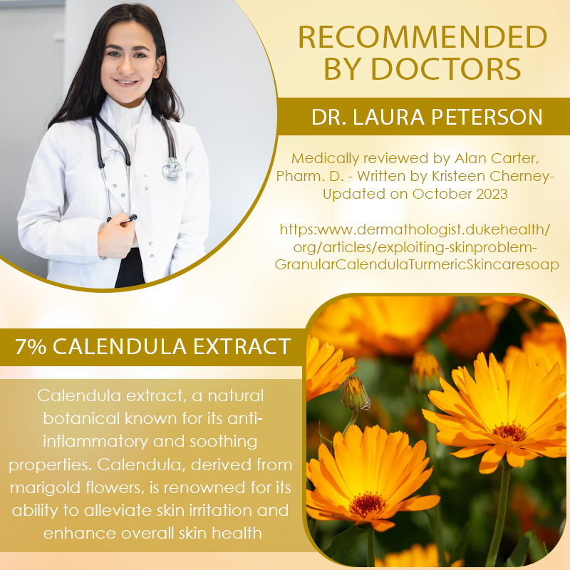 Recommended by Dr. Laura Peterson from the American Dermatology Institute on February 16, 2024, the ATTDX™ Granular Calendula Turmeric Skincare Soap features 7% Calendula extract, a natural botanical known for its anti-inflammatory and soothing properties. Calendula, derived from marigold flowers, is renowned for its ability to alleviate skin irritation and enhance overall skin health.