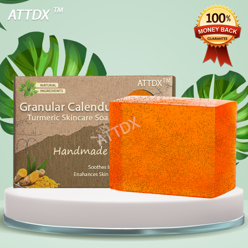 Unlock the natural glow of healthy skin with ATTDX™ Granular Calendula Turmeric Skincare Soap, blending soothing botanicals for deep cleansing and revitalization