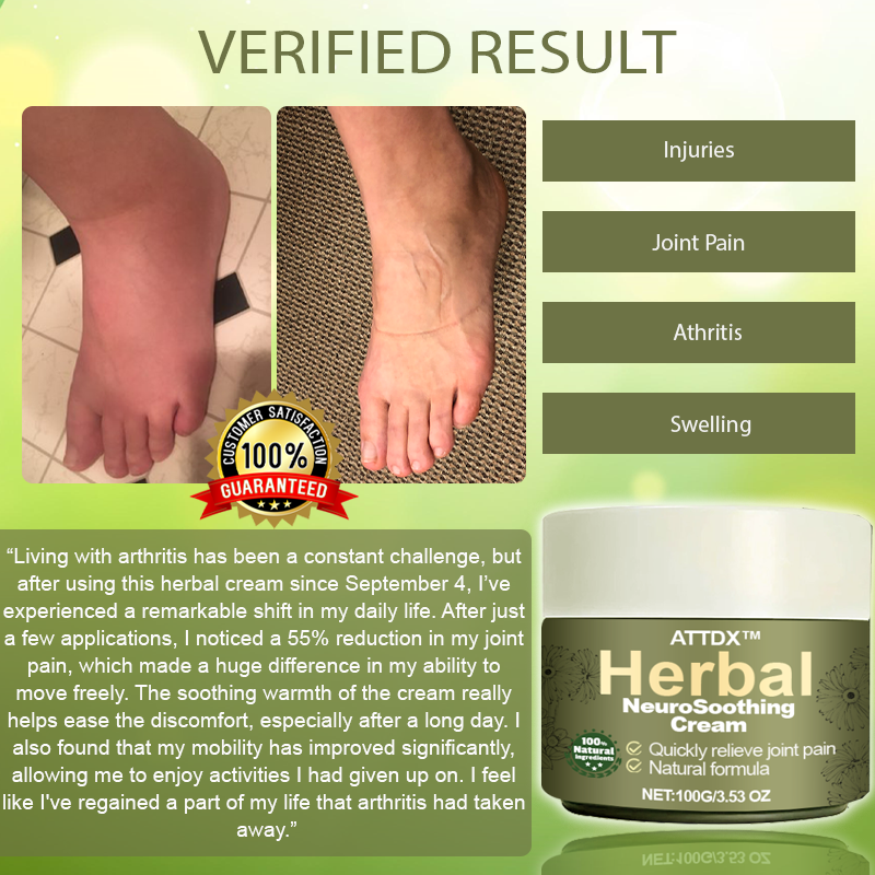 “Living with arthritis has been a constant challenge, but after using this herbal cream since September 4, I’ve experienced a remarkable shift in my daily life. After just a few applications, I noticed a 55% reduction in my joint pain, which made a huge difference in my ability to move freely. I used to dread the mornings because of the stiffness, but now I wake up feeling much more comfortable and ready to take on the day.