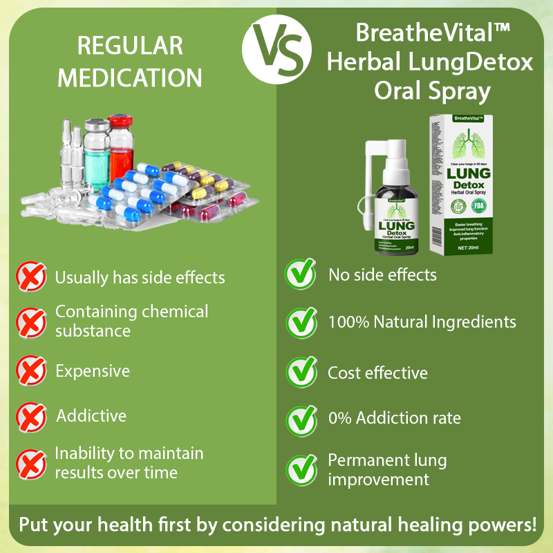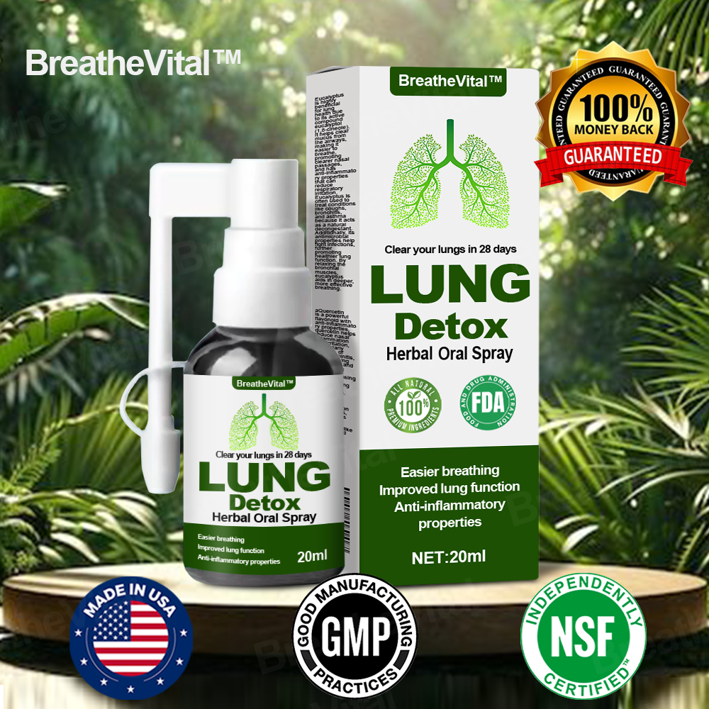 Respiratory health is essential for overall well-being, as it supports the exchange of oxygen and carbon dioxide needed for the body to function. Issues like congestion, coughs, and mucus buildup can hinder breathing, while more serious conditions like bronchitis and asthma can inflame and narrow airways, making breathing difficult. Taking care of the respiratory system helps prevent infections, manage chronic conditions, and keep lungs functioning optimally for a healthy, active life. BreatheVital™ Herbal LungDetox Oral Spray helps address these issues by cleansing and detoxifying the lungs, clearing out mucus buildup, and reducing inflammation. It improves breathing and lung function, helping to reduce respiratory issues like congestion and coughs, while enhancing overall lung capacity, making breathing easier during physical activity and daily routines.