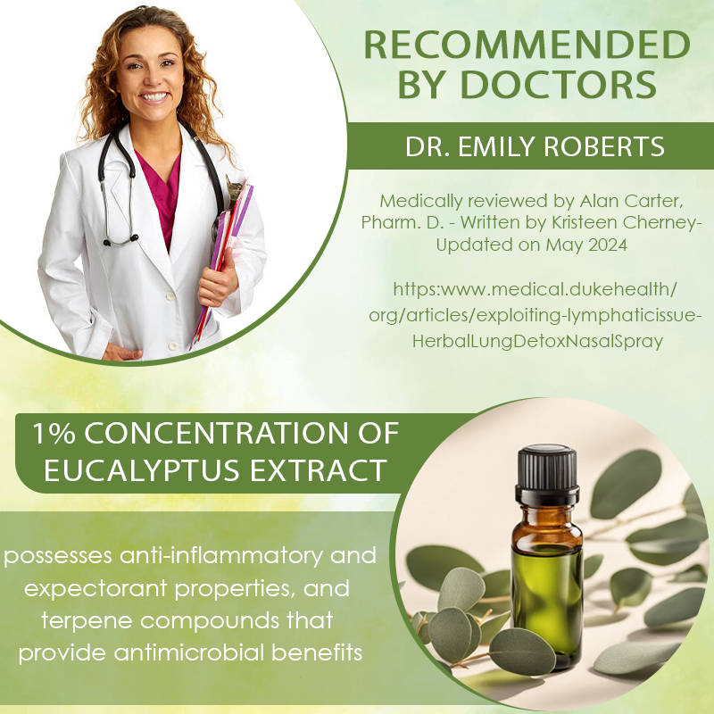 Certified by Dr. Emily Roberts, Pulmonologist at the National Institute for Respiratory Health, on May 16, 2024, BreatheVital™ Herbal LungDetox Oral Spray has been shown to effectively support respiratory health. Formulated with a 1% concentration of eucalyptus extract, this product harnesses the power of its key components, including Eucalyptol, which possesses anti-inflammatory and expectorant properties, and terpene compounds that provide antimicrobial benefits.