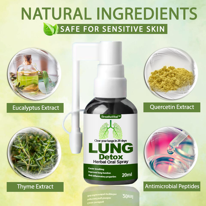 BreatheVital™ Herbal LungDetox Oral Spray combines the powerful benefits of eucalyptus extract, quercetin extract, thyme extract, and antimicrobial peptides to support respiratory health. Eucalyptus extract, rich in eucalyptol, acts as a natural decongestant that helps clear mucus from the airways and reduce respiratory irritation. Quercetin extract provides anti-inflammatory properties that alleviate nasal inflammation and ease symptoms associated with allergic rhinitis, while also combating oxidative stress in the lungs. Thyme extract is known for its antimicrobial and expectorant properties, promoting lung function and aiding in the elimination of excess mucus. Additionally, antimicrobial peptides enhance the body’s natural defense mechanisms against pathogens, contributing to overall lung health and clearer airways.