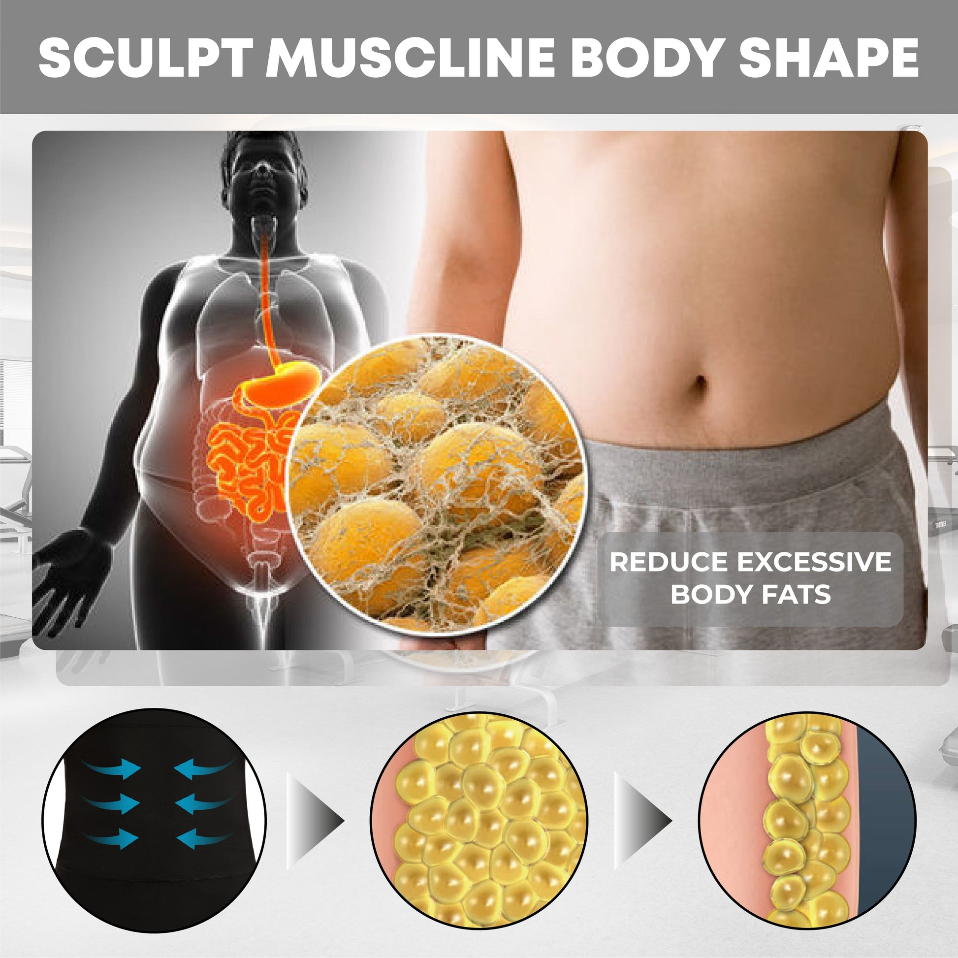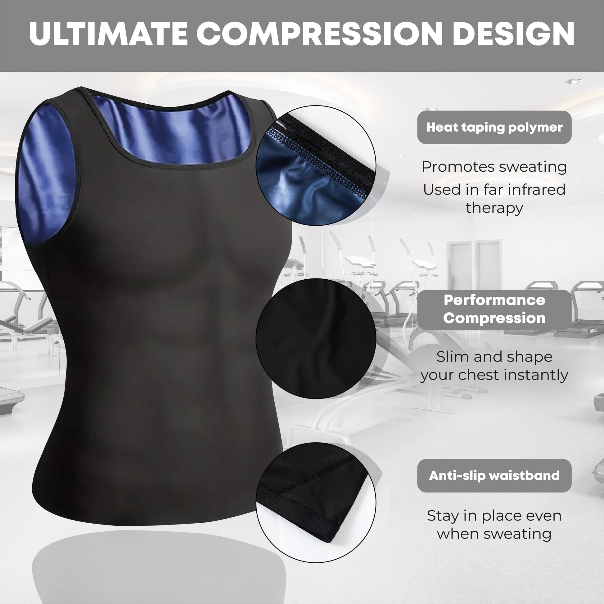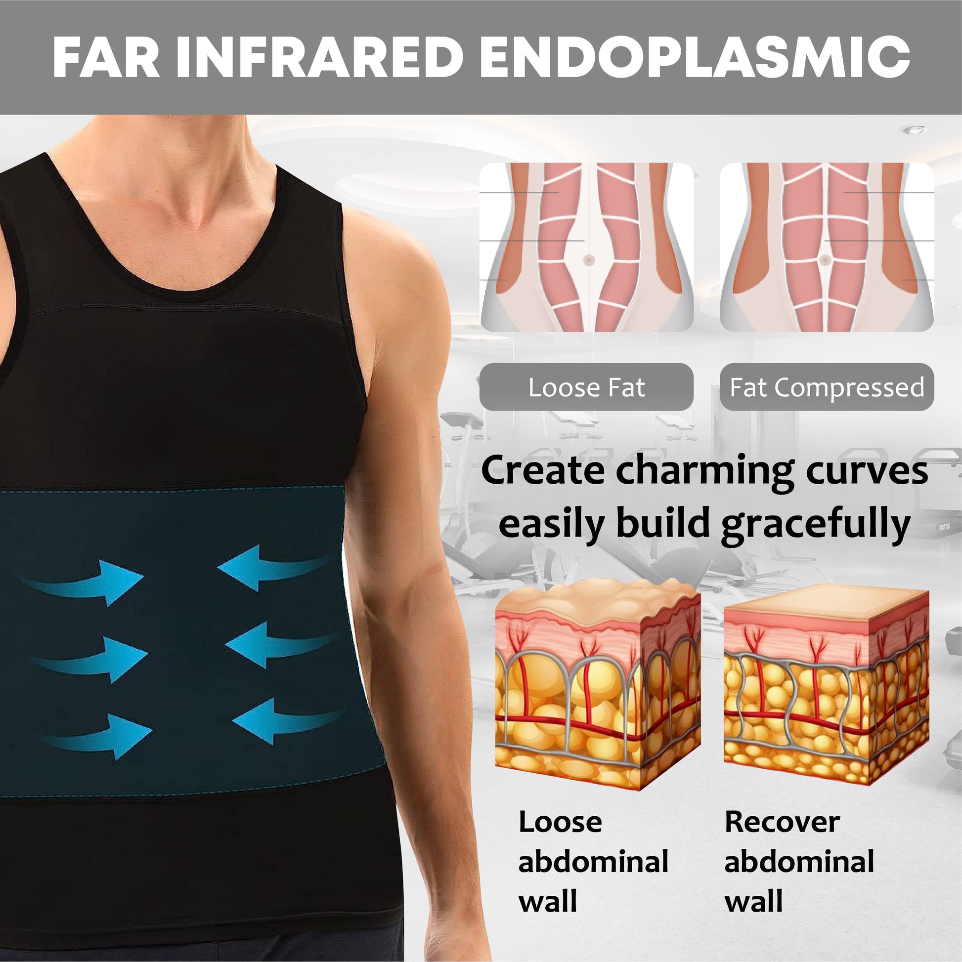 RICPIND BurnFit Tighten Tank Top, a pioneering compression shirt crafted to enhance abdominal firmness for men. Engineered with advanced Far Infrared Therapy, it effectively reduces the appearance of abdominal tissue, sculpting a streamlined upper body appearance. Crafted from heat-trapping polymers, it delivers targeted compression from all angles, coupled with acupressure stimulation for optimal results. Perfect for those seeking a sleek, toned look, it blends innovative technology with superior comfort and style.