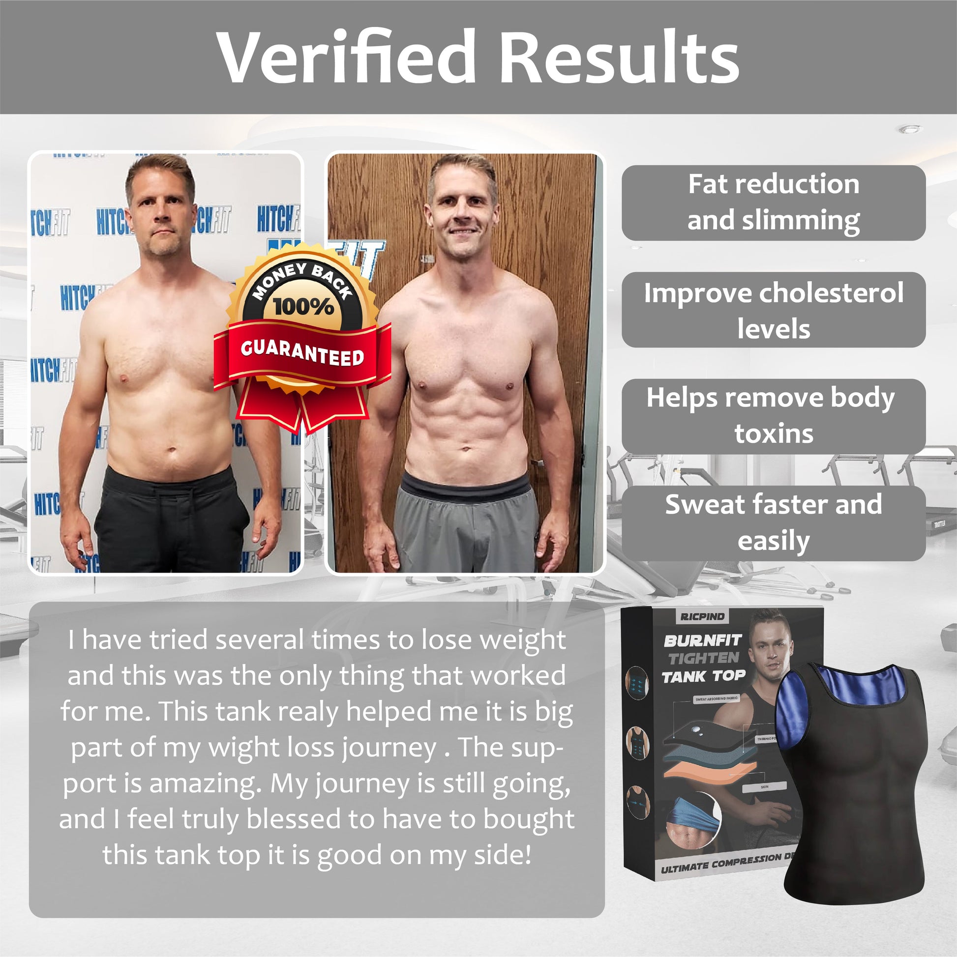 “I'm Jack, a 40-year-old American who struggled with weight and self-image, especially around my chest. Determined to make a change, I found the RICPIND BurnFit Tighten Tank Top, which uses Far Infrared Therapy to target stubborn areas. Despite initial skepticism, I incorporated it into my routine and was pleasantly surprised by noticeable results within weeks. With consistent use, I shed excess weight, regained confidence, and now enthusiastically recommend MenSlim to others facing similar challenges.” - Jack Bennett, 40 from San Francisco, California