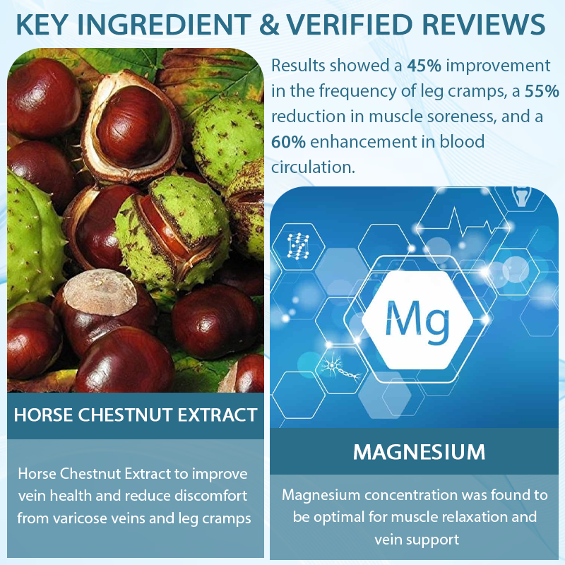 CrampGuard™ Leg Muscle and VeinRelief Cream combines the benefits of magnesium and Horse Chestnut Extract to address leg cramps and varicose veins. Magnesium supports muscle relaxation, reduces cramps, and enhances circulation to minimize blood pooling, especially beneficial for varicose veins. Horse Chestnut Extract, rich in aescin, strengthens vein walls, improves blood flow, and reduces swelling, effectively alleviating pain and heaviness in the legs. This dual-action formula targets poor circulation and venous insufficiency to relieve discomfort and promote vein health.