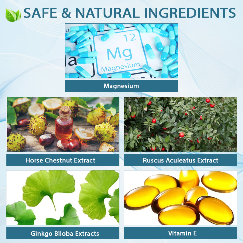 CrampGuard™ Leg Muscle and VeinRelief Cream combines powerful ingredients to provide effective relief. Magnesium helps regulate muscle function, reducing cramps and promoting relaxation. Horse Chestnut Extract strengthens veins and improves circulation, while Ruscus Aculeatus Extract reduces swelling and discomfort in the legs. Ginkgo Biloba Extract enhances blood flow, and Vitamin E provides antioxidant protection, supporting overall skin health and soothing muscle tension.