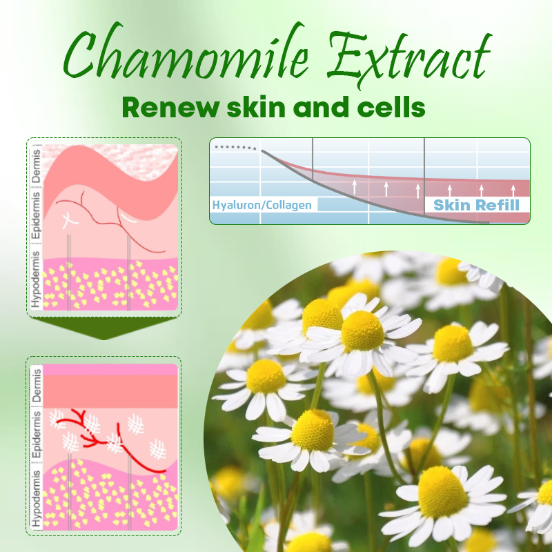 Chamomile extract aids in firming the skin by reducing inflammation and soothing irritation, which helps improve overall skin texture. Its calming properties contribute to a more even and resilient skin surface, enhancing firmness and reducing signs of stress or fatigue.