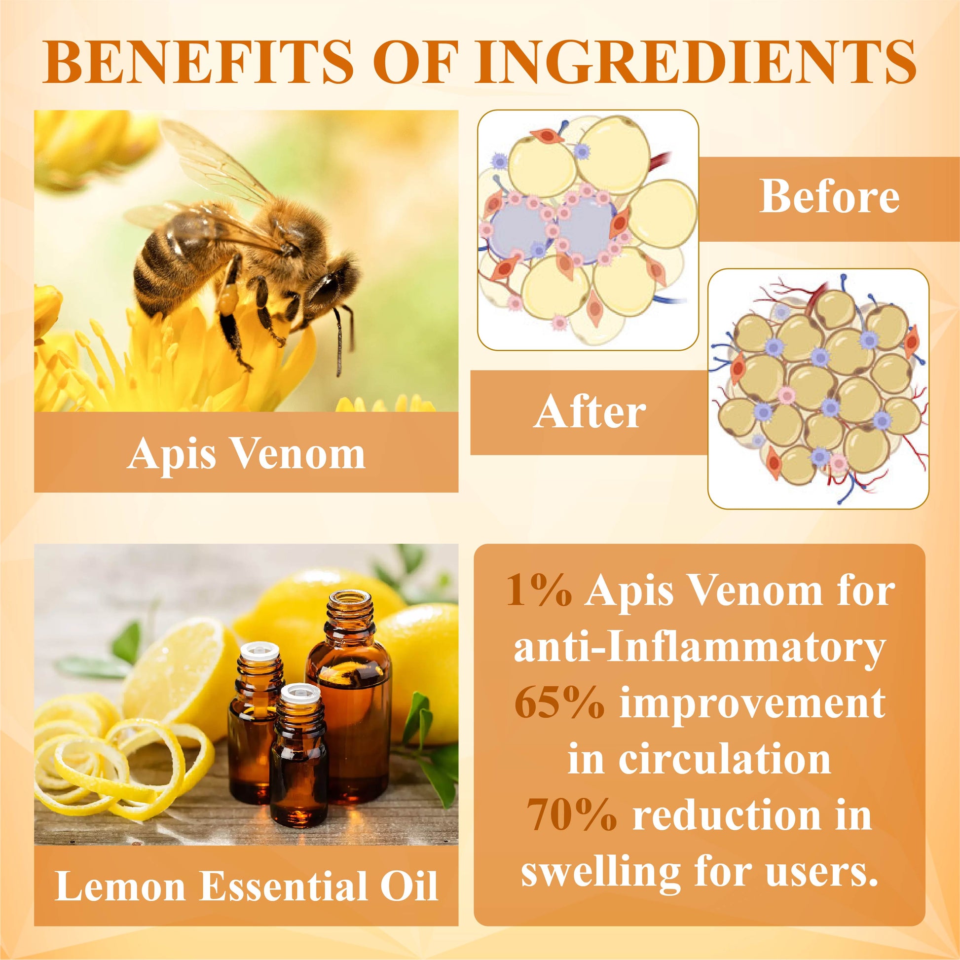 DetoxFlow™ Apis Venom LymphSlimming Inhaler Stick combines Apis venom to reduce inflammation and enhance lymphatic drainage, while Panax notoginseng extract boosts circulation and reduces fluid retention. Lemon Essential Oil aids in fat breakdown and detoxification, promoting better lymphatic flow. Ginger Root Extract supports circulation and toxin removal, improving lymphatic health. Menthol provides a cooling effect, relieving swelling and enhancing the absorption of the other ingredients.
