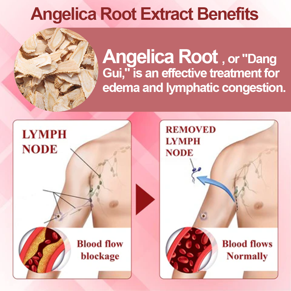 DetoxFlow™ EdemaSupport Lymphatic Drainage Massage Cream features Angelica Root Extract, a powerful ingredient known for its ability to relieve swelling and discomfort. It promotes improved blood circulation and reduces fluid retention, making it effective in addressing both edema and lymphatic issues. Rich in bioactive compounds like ferulic acid and polysaccharides, Angelica Root Extract strengthens blood vessels, minimizes inflammation, and supports lymphatic drainage. This gentle and natural solution helps manage swelling while enhancing skin health, providing relief with fewer systemic side effects.