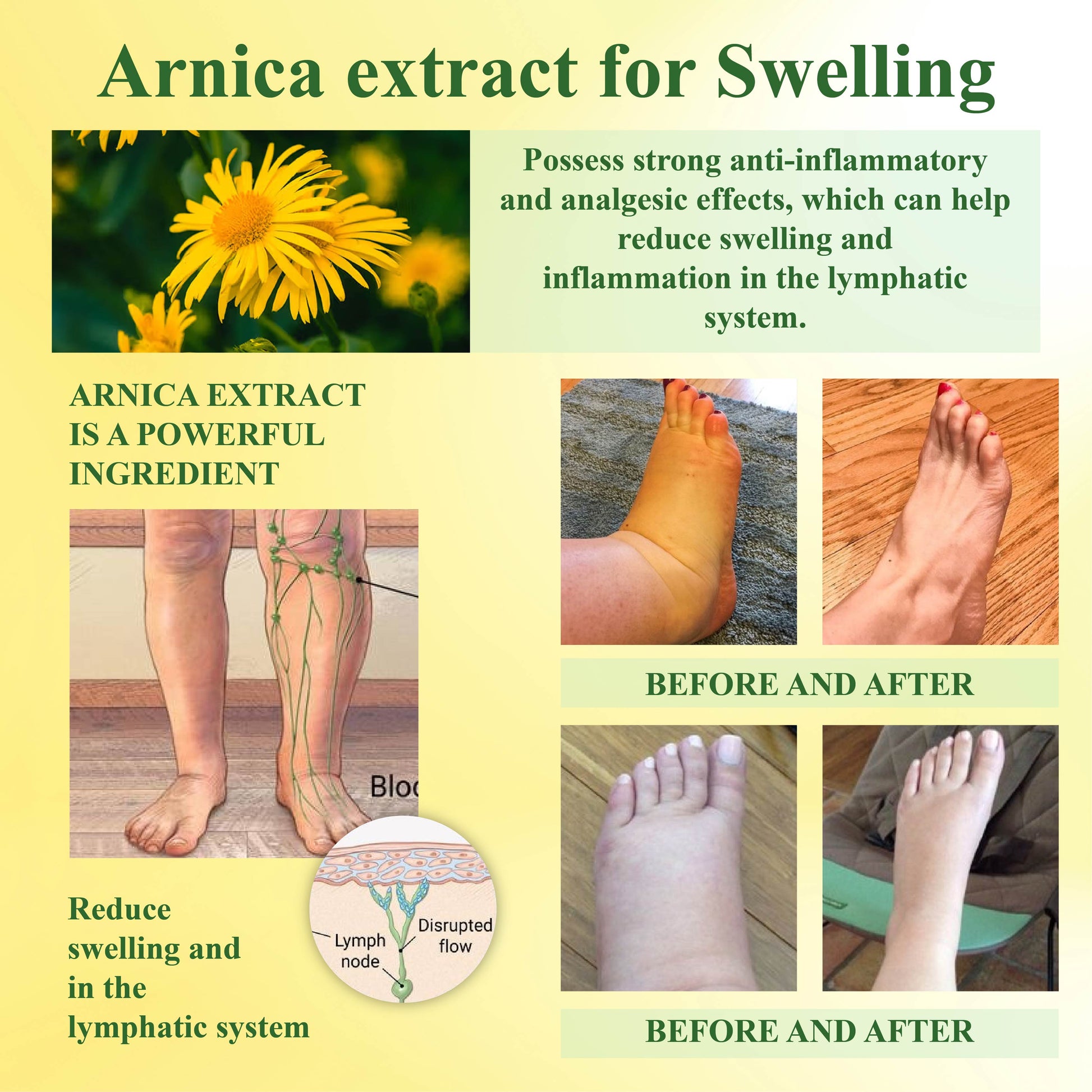DetoxFlow™ Lymphatic Support SwellingEase Oil harnesses the soothing power of arnica extract, known for its remarkable ability to reduce swelling and inflammation in the lymphatic system. The active components, including helianol, arnicatin, and flavonoids, work synergistically to improve circulation and lymphatic drainage, effectively alleviating edema and promoting the removal of excess fluids and toxins. Arnica’s anti-inflammatory properties help relieve discomfort from swollen lymph nodes and enhance overall skin appearance. When used with gentle massage or topical application, DetoxFlow™ maximizes the benefits of lymphatic drainage therapies, supporting weight management by improving blood flow and circulation to break down lipid deposits.