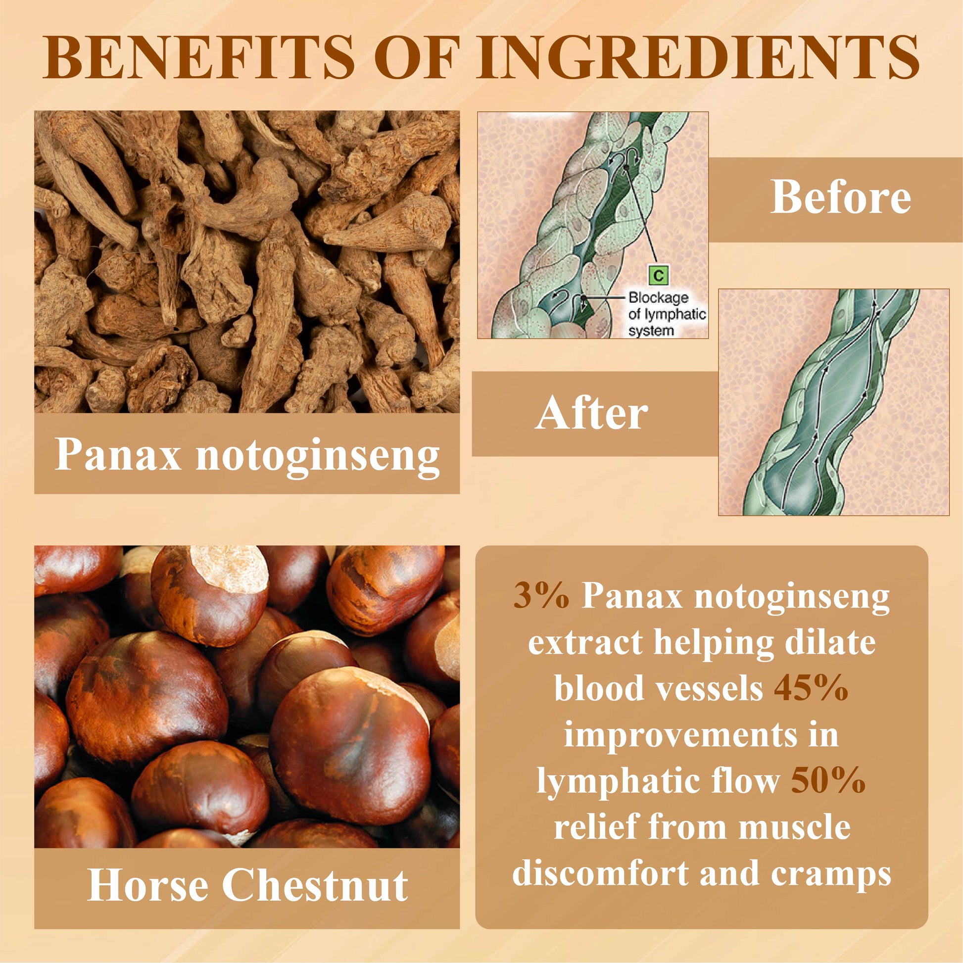 While aescin from Horse Chestnut strengthens blood vessels, reduces capillary permeability, and prevents fluid buildup. Together, these natural ingredients alleviate swelling, enhance blood flow, and support overall vascular function.