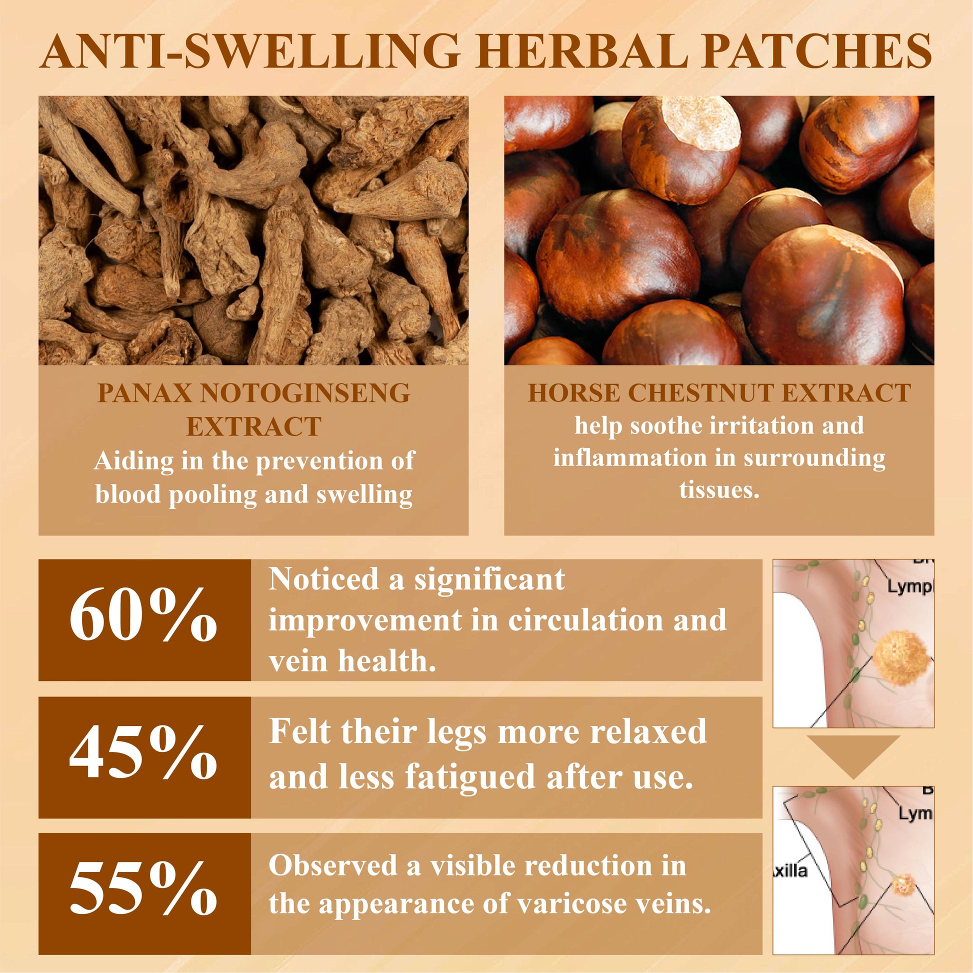 DetoxFlow™ LymphEase Anti-Swelling Herbal Patches combine powerful ingredients to support lymphatic health and circulation. Panax notoginseng extract helps improve blood flow and reduces fluid buildup, while Horse Chestnut Extract strengthens blood vessels, preventing fluid leakage and alleviating discomfort from varicose veins. Millettia reticulata promotes circulation and reduces inflammation, while Caulis fasciata and Cuscuta australis work together to strengthen veins and prevent further fluid retention. These ingredients work synergistically to enhance circulation, reduce discomfort, and promote healthier lymphatic function.
