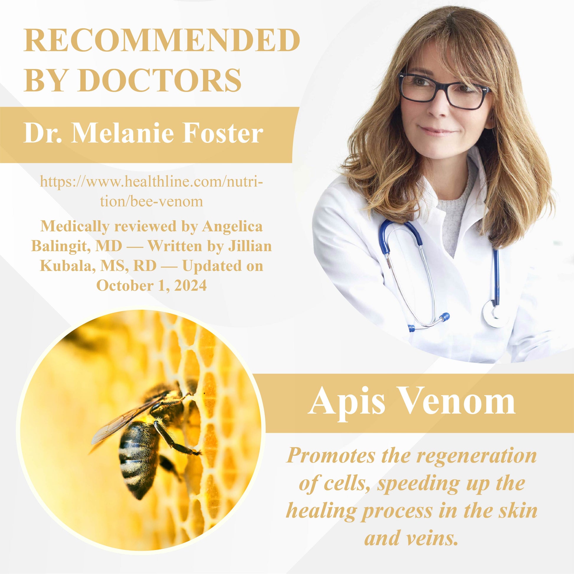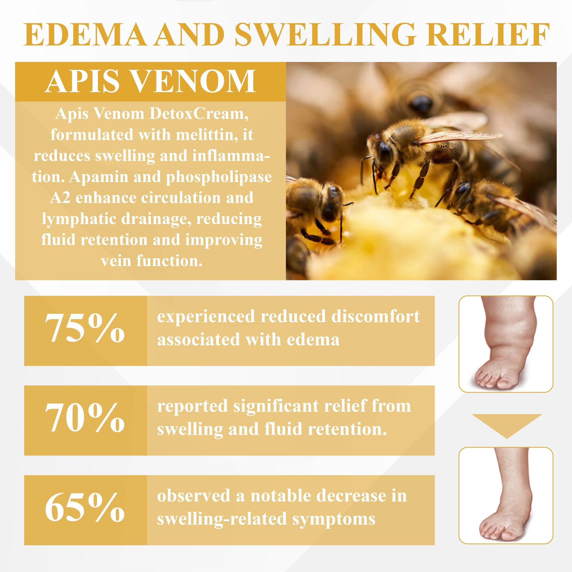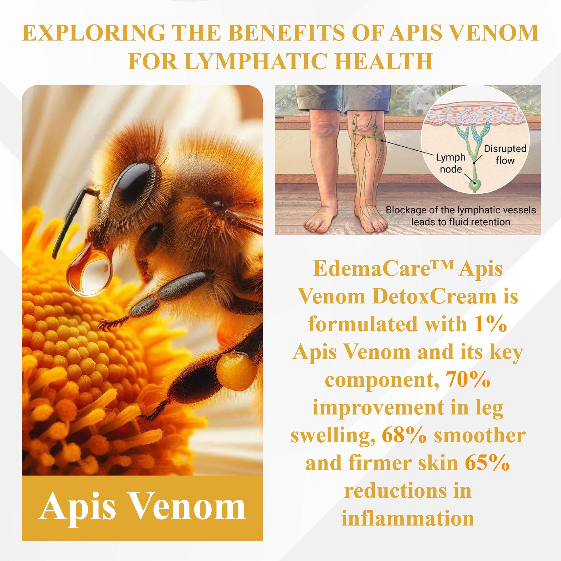 According to Dr. Noema Foster from the Wellness Institute, Apis Venom has anti-inflammatory properties that reduce swelling by improving blood circulation and strengthening blood vessel walls, preventing fluid leakage. EdemaCare™ Apis Venom DetoxCream, with 1% Apis Venom, addresses lymphatic health and varicose veins, enhancing lymphatic function, reducing inflammation, and eliminating toxins.