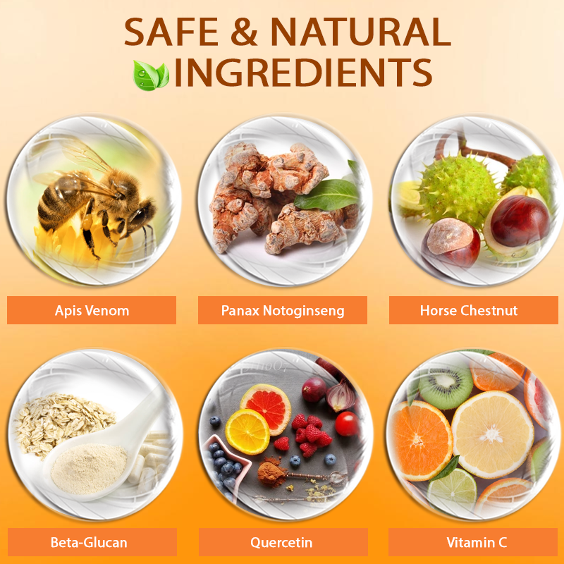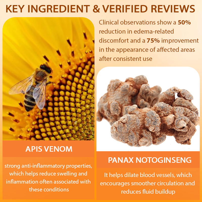 EdemaCare™ ApisVenom DrainageBody Cream combines powerful ingredients to improve lymphatic drainage and reduce swelling. Apis venom helps reduce inflammation and promotes fluid drainage, while Panax notoginseng extract supports blood circulation and strengthens veins. Horse Chestnut extract alleviates swelling and enhances vein health, while Beta-Glucan and Quercetin provide antioxidant protection and reduce inflammation. Vitamin C supports collagen production, helping to improve skin elasticity and overall vascular health.