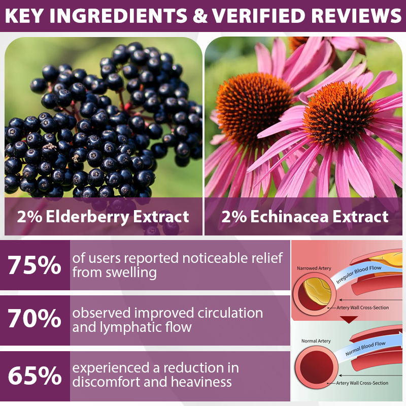 EdemaCare™ Elderberry Lymphatic Massage Cream leverages the power of Echinacea Extract to enhance lymphatic health and manage edema. Polysaccharides in Echinacea help reduce inflammation by modulating the immune response, easing swelling and discomfort associated with fluid retention.
