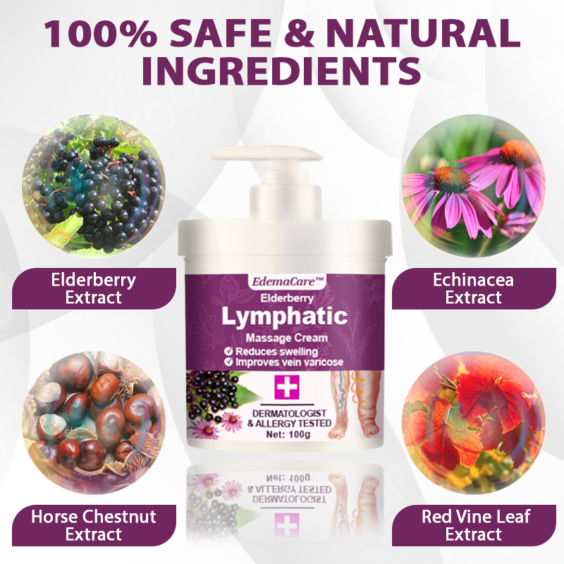 EdemaCare™ Elderberry Lymphatic Massage Cream combines powerful ingredients to support lymphatic health and reduce swelling. Elderberry Extract helps boost immune function and reduce inflammation, while Echinacea Extract promotes circulation and detoxification. Horse Chestnut Extract strengthens blood vessels and reduces fluid retention, and Red Vine Leaf Extract enhances circulation, alleviating discomfort from swelling. These ingredients work synergistically to improve lymphatic drainage and support overall well-being.