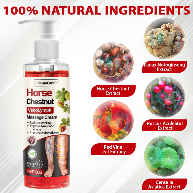 EdemaCare™ Horse Chestnut VenoLymph Massage Cream combines Horse Chestnut Extract to improve circulation and reduce swelling. Red Vine Leaf Extract enhances microcirculation and supports lymphatic flow, helping reduce toxin buildup. Panax Notoginseng Extract strengthens blood vessels, while Ruscus Aculeatus Extract alleviates fluid retention and promotes better lymphatic drainage. Centella Asiatica Extract promotes skin healing and reduces inflammation, offering additional relief from discomfort and swelling.