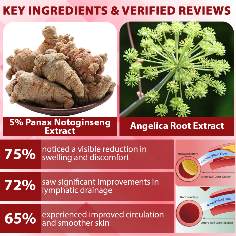 These compounds help reduce swelling by improving blood flow and strengthening capillary walls, preventing fluid leakage into surrounding tissues. Similarly, Angelica Root Extract, rich in ferulic acid and ligustilide, supports lymphatic health by boosting circulation, reducing fluid retention, and calming inflammation. Therefore, our EdemaCare™ VenoLymph Massage Therapy Cream formula with 5% Panax Notoginseng Extract, combined with Angelica Root Extract and two other key ingredients, effectively addresses issues such as edema, lymphatic health, and varicose veins.