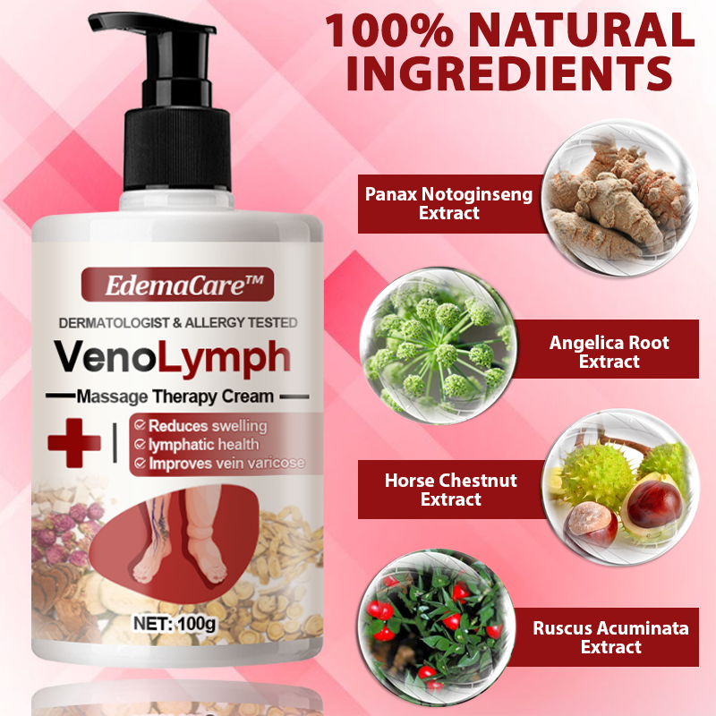 EdemaCare™ VenoLymph Massage Therapy Cream features Angelica Root Extract, a powerful ingredient known for its ability to relieve swelling and discomfort. It promotes improved blood circulation and reduces fluid retention, making it effective in addressing both edema and lymphatic issues.
