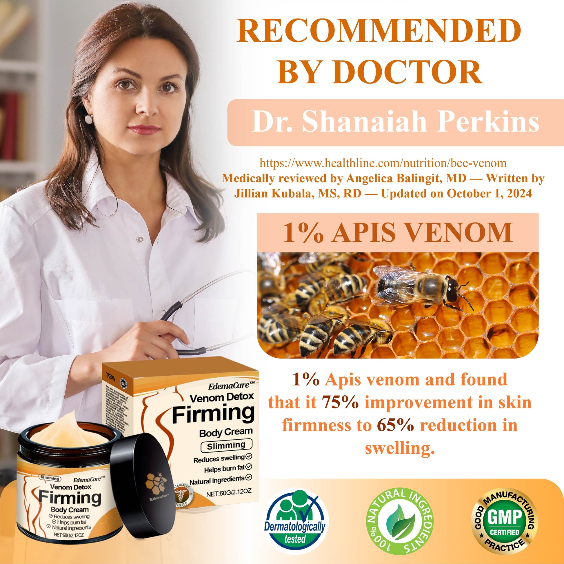 Endorsed by Dr. Shanaiah Perkins, Dermatologist, Skin Health Institute, August 13, 2024, EdemaCare™ VenomDetox FirmingBody Cream has demonstrated significant benefits in improving skin appearance and promoting lymphatic health.