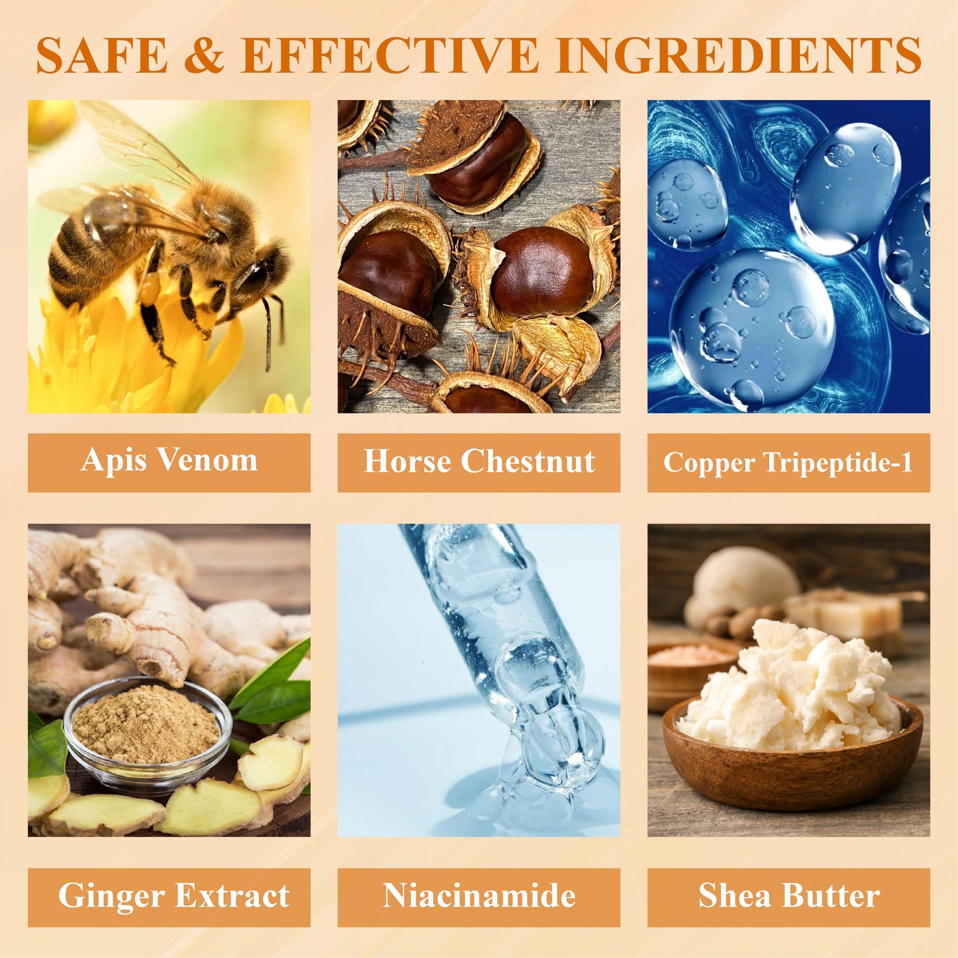 EdemaCare™ VenomDetox FirmingBody Cream combines powerful ingredients to improve skin health and reduce swelling. Apis venom promotes circulation and lymphatic flow, while Horse Chestnut Extract reduces fluid retention and strengthens blood vessels. Copper Tripeptide-1 enhances skin regeneration and firmness, while Ginger Extract boosts detoxification and reduces inflammation. Niacinamide improves skin tone and elasticity, and Shea Butter deeply nourishes and moisturizes, leaving the skin soft and smooth.