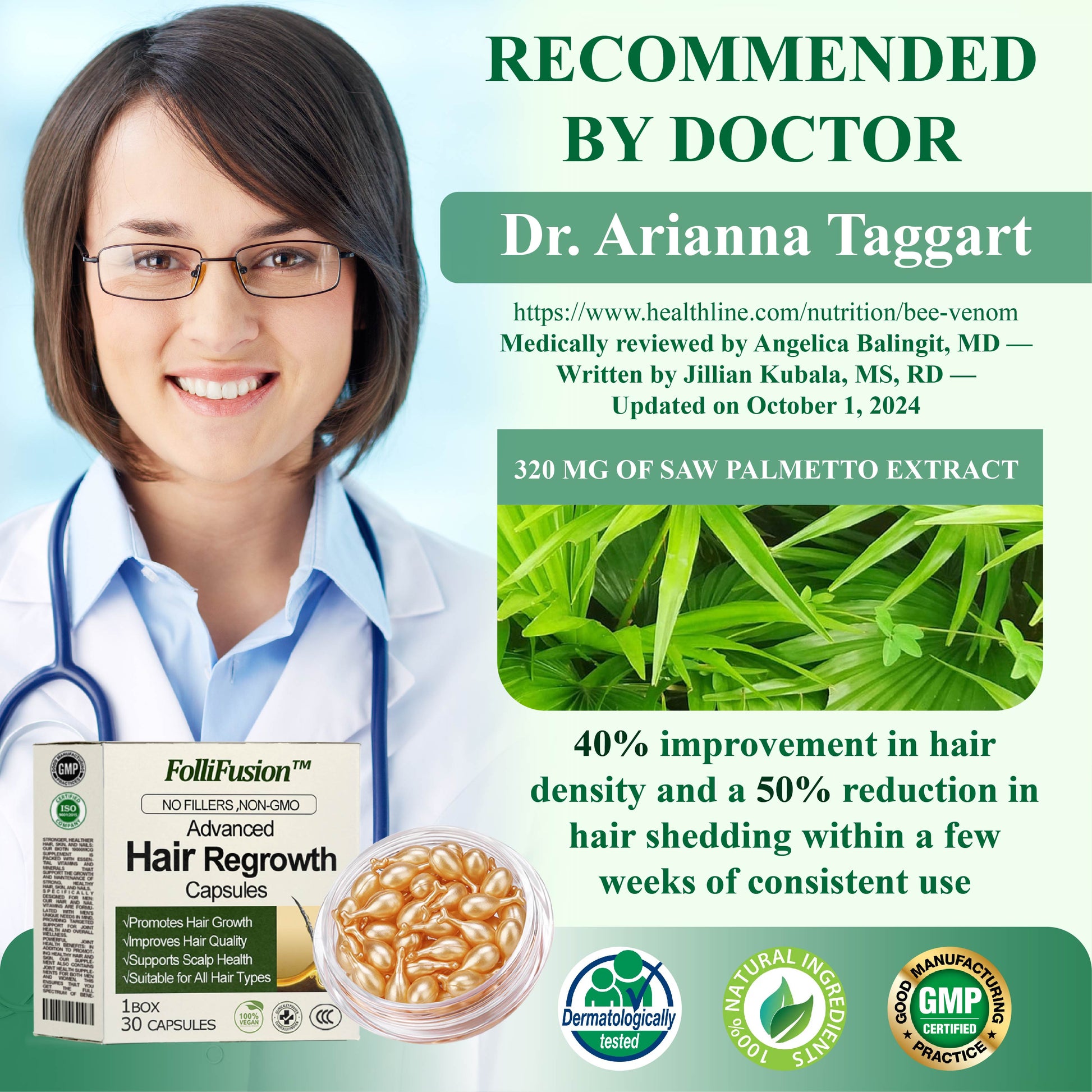 Certified by Dr. Arianna Taggart, a renowned dermatologist at the National Institute of Hair Health, FolliFusion™ Advanced Hair Regrowth Capsules offer a scientifically-backed solution for hair thinning and loss.