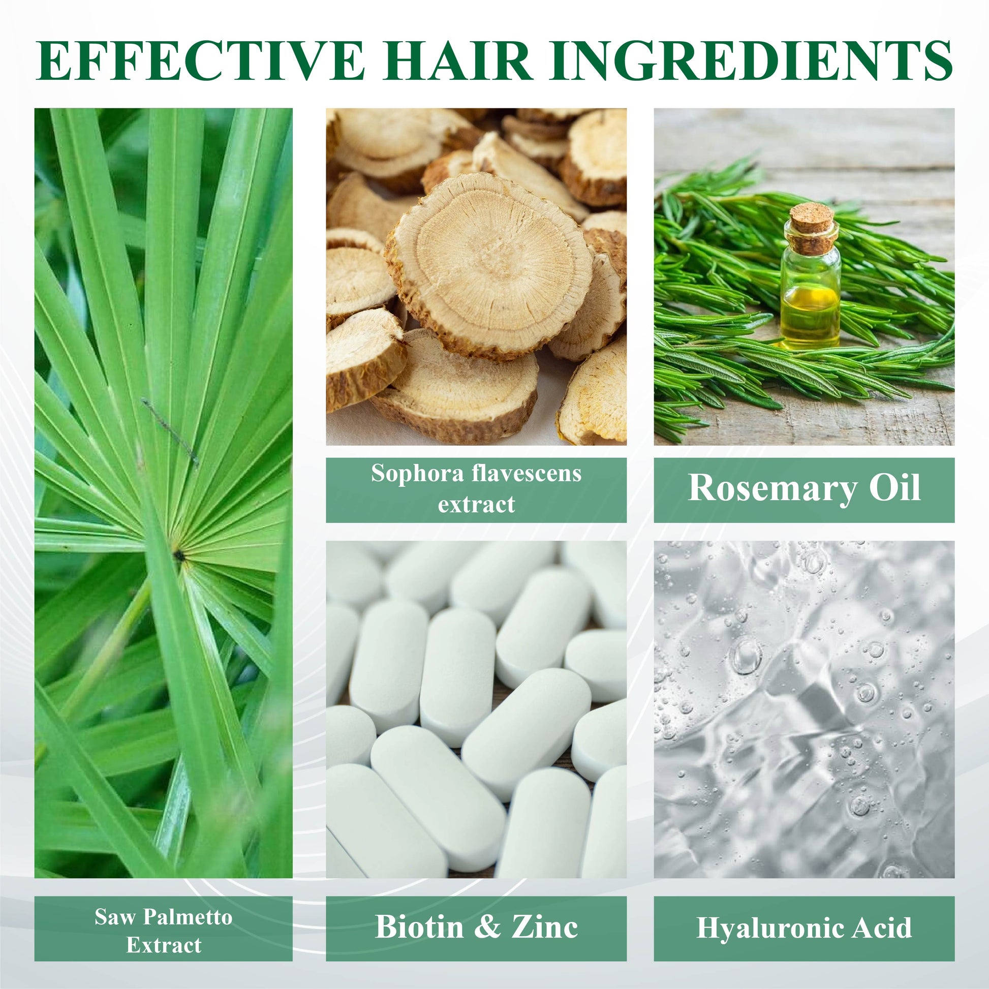 FolliFusion™ Advanced Hair Regrowth Capsules combine powerful ingredients that support healthy hair growth. Saw Palmetto Extract helps block DHT, a hormone responsible for hair thinning, while Sophora flavescens extract supports scalp health and reduces inflammation. Rosemary Oil stimulates blood circulation to the follicles, promoting hair growth, and Biotin boosts keratin production, improving hair strength. Zinc and Hyaluronic Acid work together to nourish the scalp, promote hydration, and maintain follicle vitality for optimal hair regeneration.