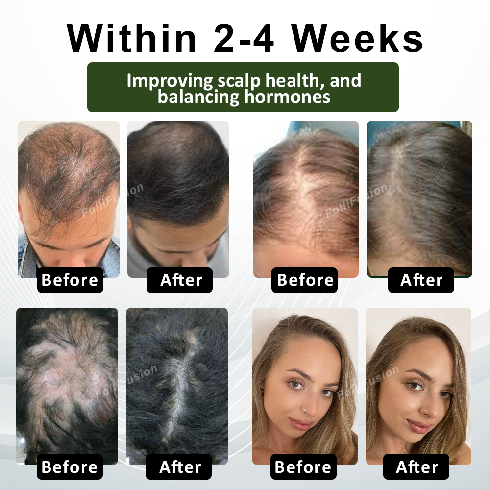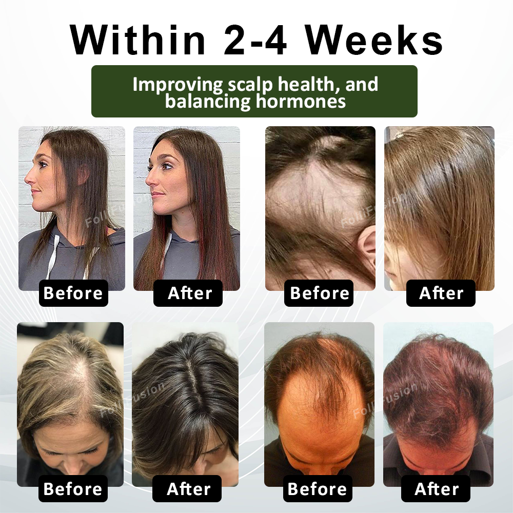 FolliFusion™ Advanced Hair Regrowth Capsules provide holistic scalp care by purifying and rejuvenating the scalp, creating the ideal environment for hair growth. These capsules effectively remove impurities, dead skin cells, and buildup, revitalizing each follicle for optimal health. This cleansing process not only alleviates scalp discomfort like flakiness and dryness but also encourages healthy, robust hair growth. With its fresh, easy-to-use formulation, FolliFusion™ effortlessly integrates into your routine, leaving your hair with natural bounce, vibrancy, and vitality.