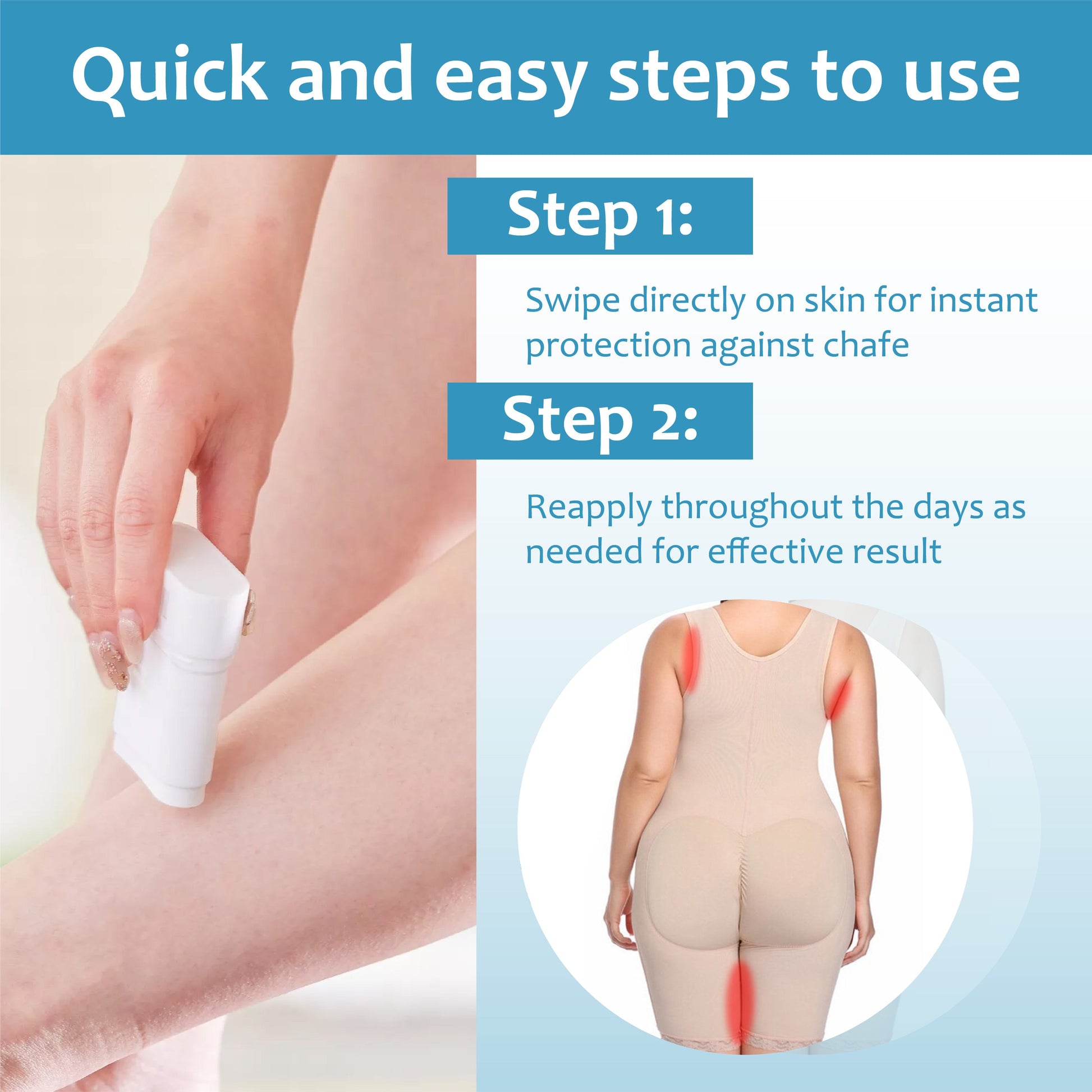 - Apply directly to the skin for immediate relief from thigh chafing.