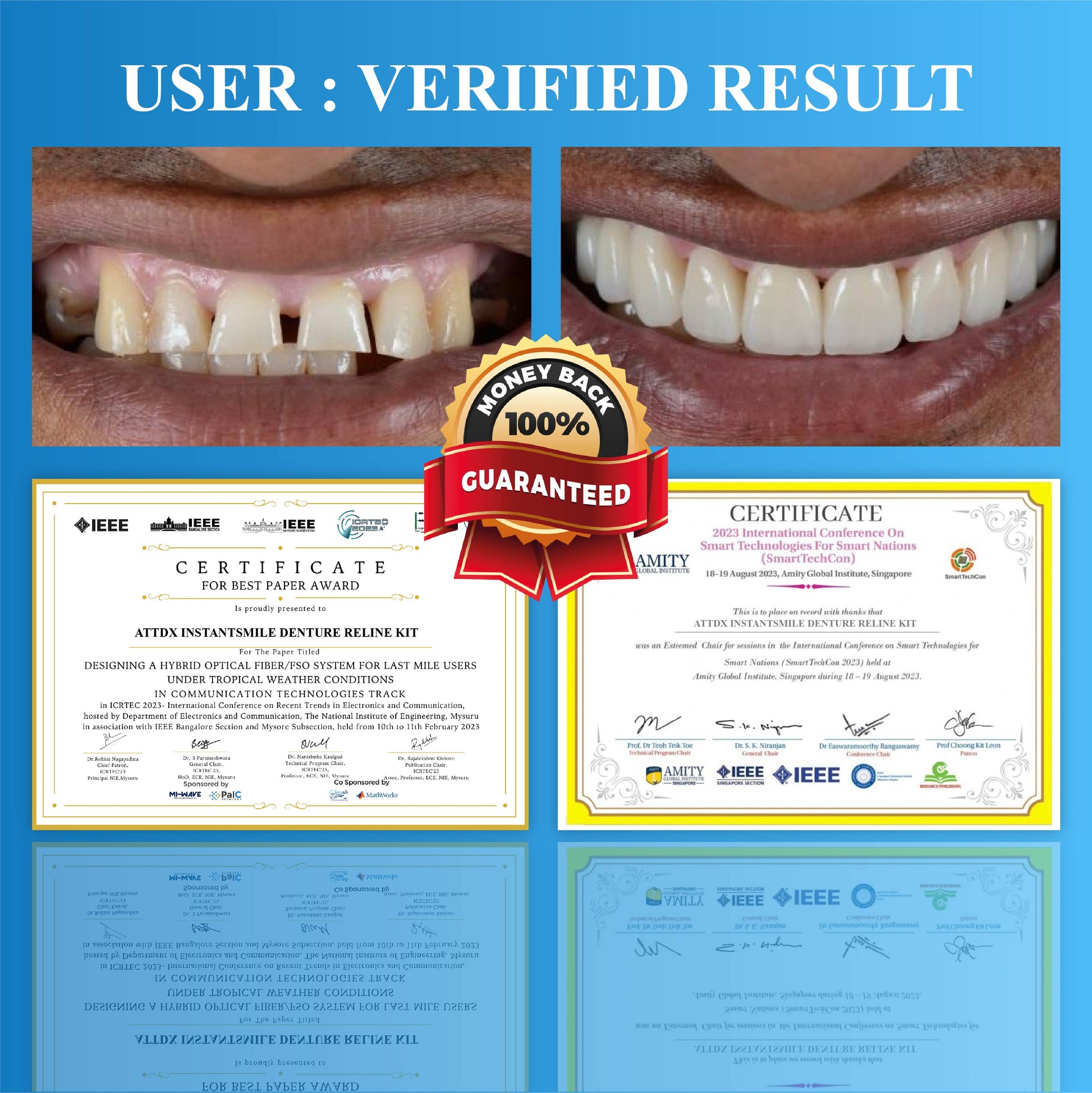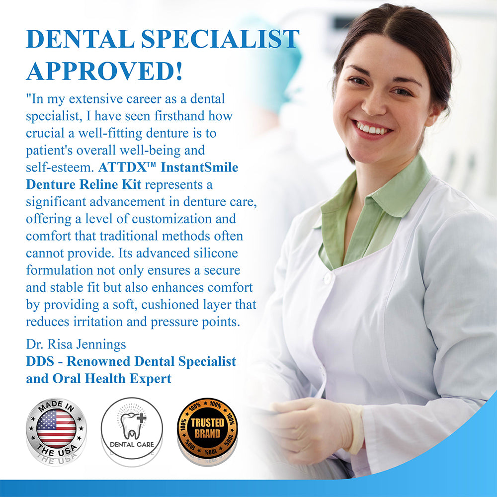 "As a dental specialist, I understand how essential a well-fitting denture is to a patient’s comfort and confidence. The InstantSmile™ Denture Reline Kit represents a breakthrough in achieving an ideal fit and comfort. Its advanced silicone layer molds to individual contours, offering a soft, cushioned fit that minimizes irritation. The kit simplifies adjustments, allowing patients to achieve an excellent reline quickly without frequent visits, making it a valuable solution for enhanced denture care and satisfaction."