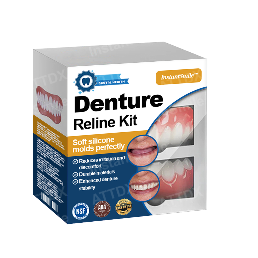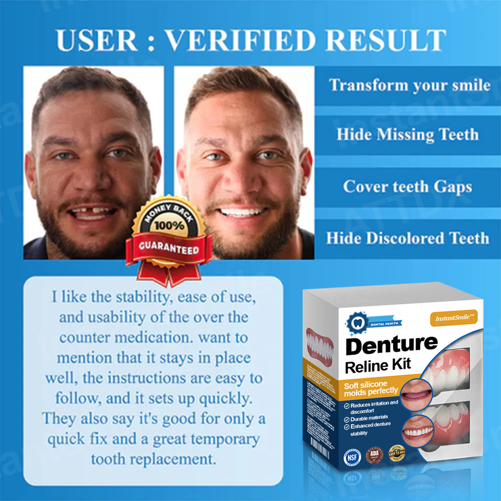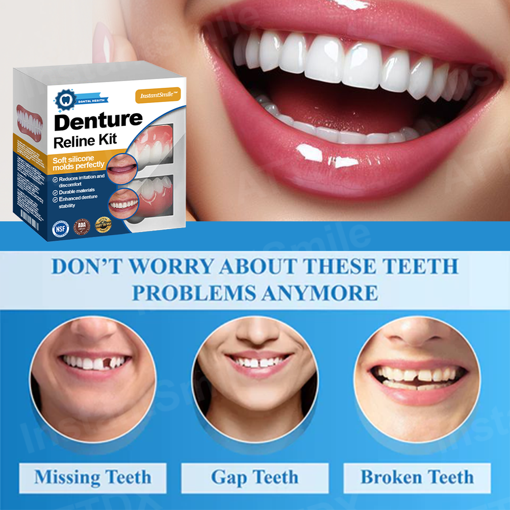 A recent American Dental Association study (October 2023) reveals that 35% of adults experience tooth discoloration, 27% have damaged or decayed teeth, 22% have crooked teeth, and 18% have missing teeth—factors that greatly affect quality of life. The InstantSmile™ Denture Reline Kit enhances comfort and confidence with soft silicone that molds to your mouth for a custom fit. Enjoy a snug, irritation-free denture experience that feels like natural teeth, empowering you to smile, eat, and socialize comfortably every day.