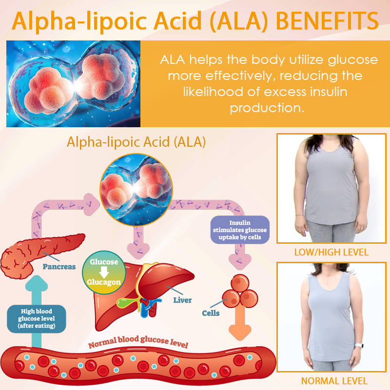 ALA’s antioxidant properties enhance insulin sensitivity, enabling the body to manage glucose more effectively and reduce excess insulin production—an essential factor for weight management and overall metabolic health. This product improves insulin sensitivity, resulting in approximately a 25% reduction in excess insulin production, which is critical for maintaining a healthy weight.