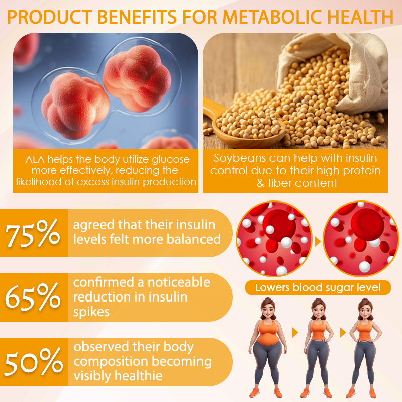 To further enhance its benefits, soybean extract serves as the secondary active ingredient. Packed with isoflavones, soy extract supports insulin sensitivity, reduces blood sugar levels, and aids in balanced metabolic function. The protein and fiber in soybeans help stabilize glycemic responses, while its healthy lipids stimulate metabolism. Together, ALA and soybean extract create a synergistic effect, offering a dual approach to managing weight, improving metabolic health, and supporting healthy blood sugar control.