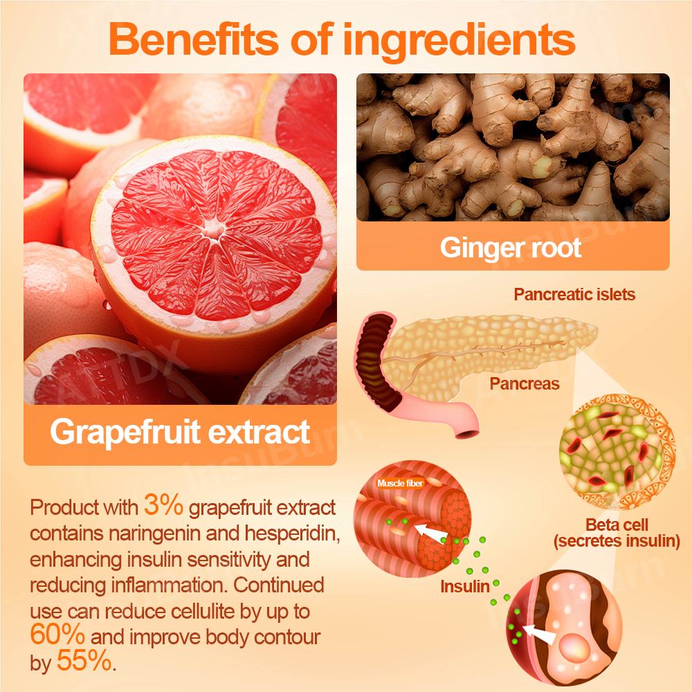 InsuBurn™ LipidFlush BodySlimming Cream uses powerful natural ingredients for weight management and skin health. Grapefruit Extract boosts insulin sensitivity, helping manage blood sugar and reduce fat storage. Ginger Root improves glucose metabolism and reduces insulin-linked inflammation. Aloe Vera hydrates and calms the skin, while Cedarwood helps curb stress-related cravings. Finally, Coenzyme Q10 enhances cellular energy and lipid metabolism, supporting a healthier, firmer skin texture.