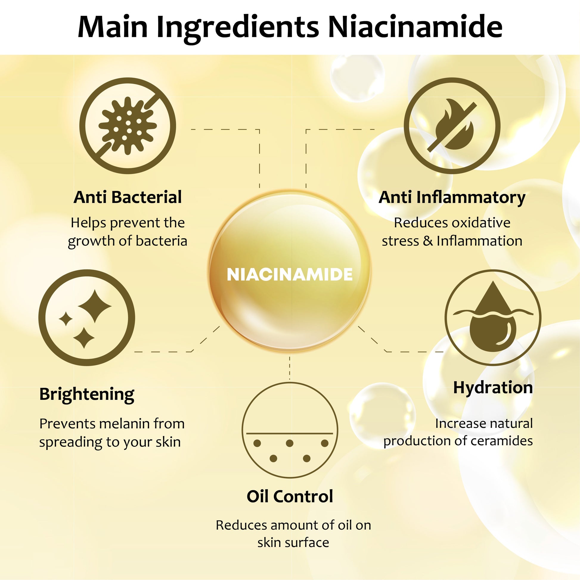 Niacinamide. Niacinamide inhibits melanin transfer, promoting skin clarity by reducing melanin production and improving skin tone.