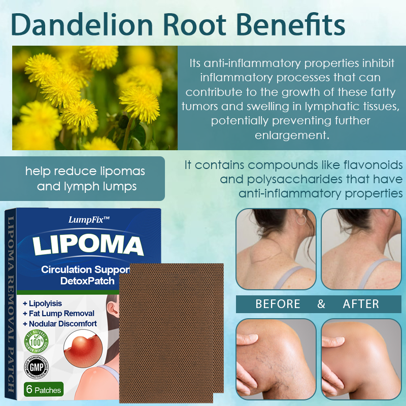 LumpFix™ Circulation Support DetoxPatch harnesses the benefits of dandelion root extract, known for its powerful flavonoids and polysaccharides that provide anti-inflammatory properties. These compounds may effectively reduce swelling and improve lymph flow, helping to alleviate discomfort associated with lymphatic issues. The lipolytic properties of dandelion root can aid in breaking down lipid deposits, potentially promoting a reduction in lipoma size. These effects contribute to the overall health of lymphatic tissues, making this patch an excellent choice for those seeking to enhance their lymphatic health.