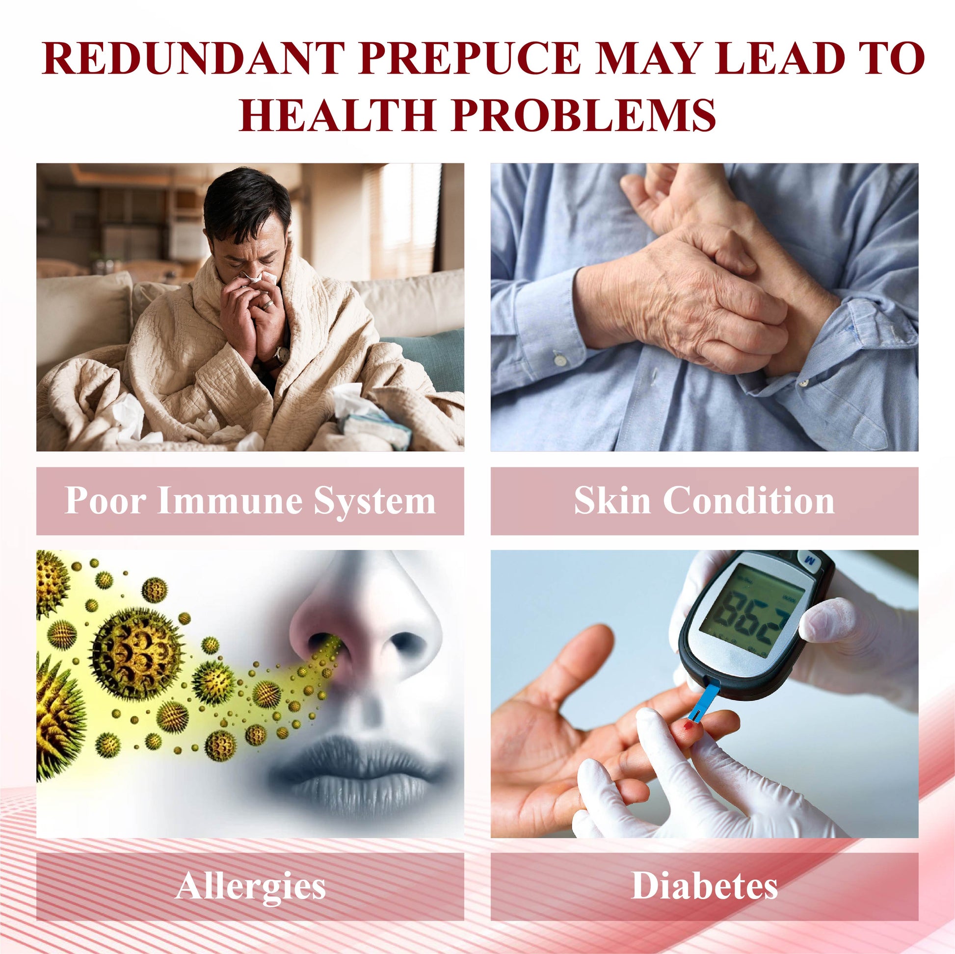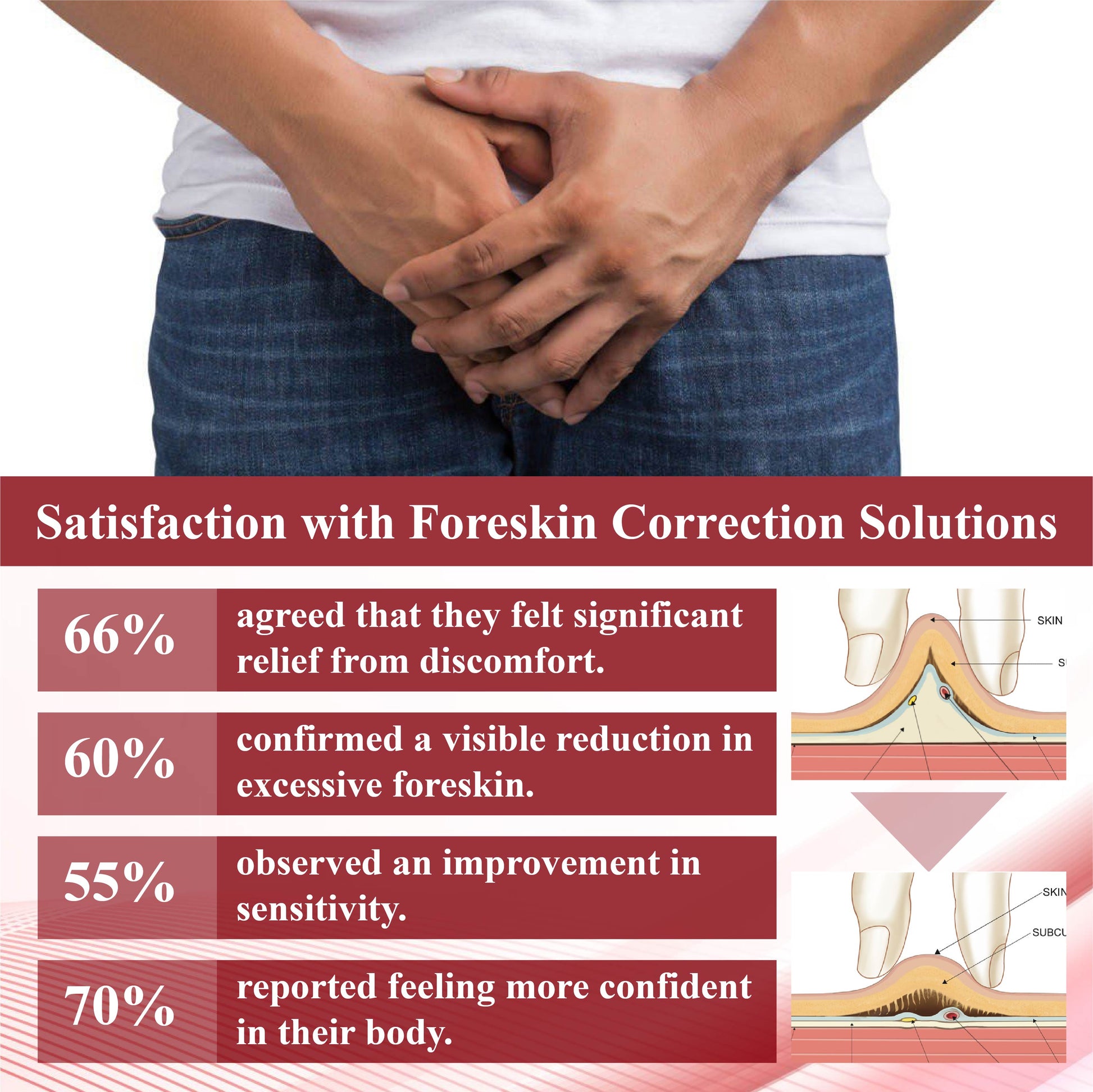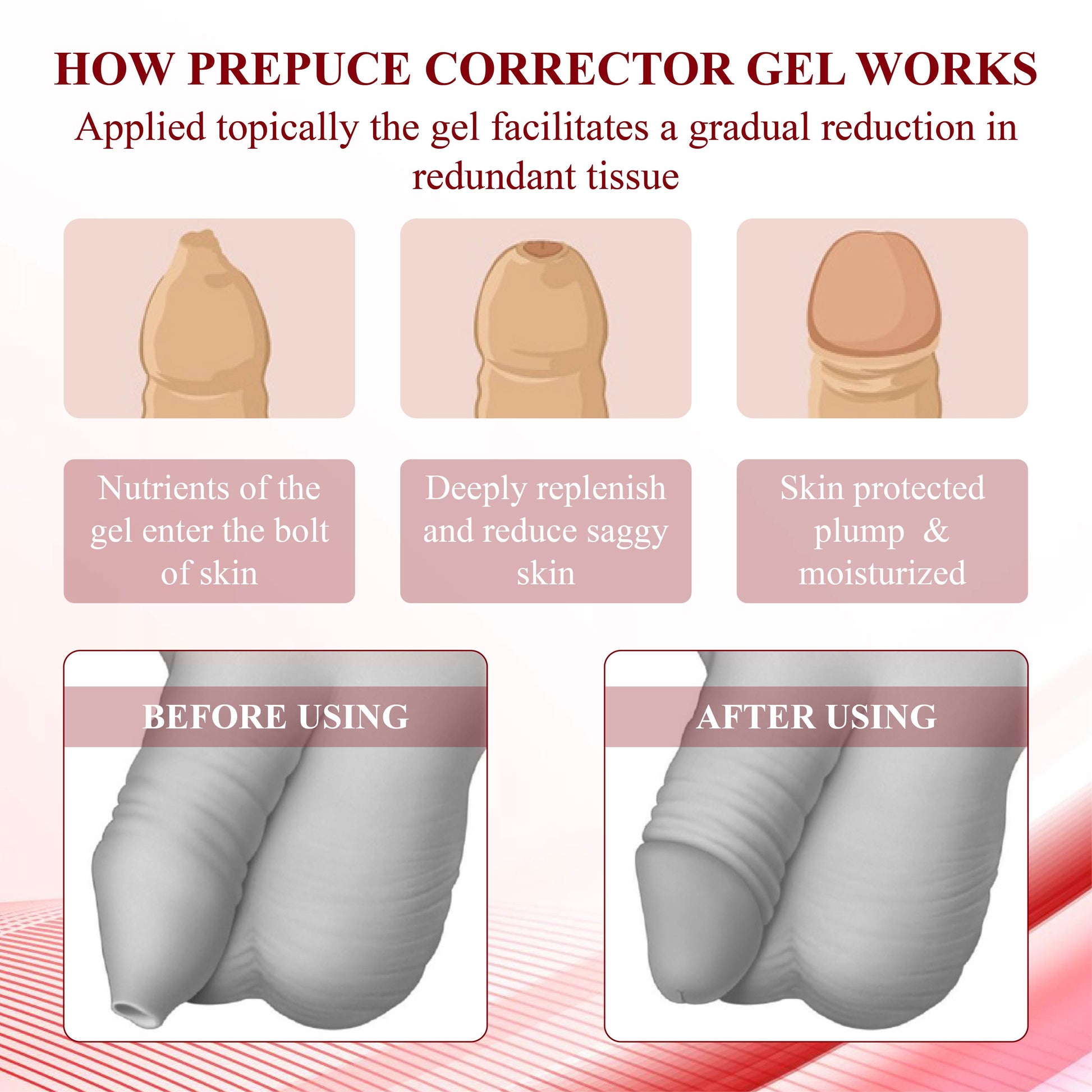 Foreskin redundancy can cause discomfort, irritation, and hygiene issues, leading to emotional distress and reduced confidence. MaleGuard™ ForeskinCare Reduction Gel addresses these concerns by moisturizing and tightening the skin to enhance elasticity and comfort, promoting better skin health and overall well-being for a more confident lifestyle.