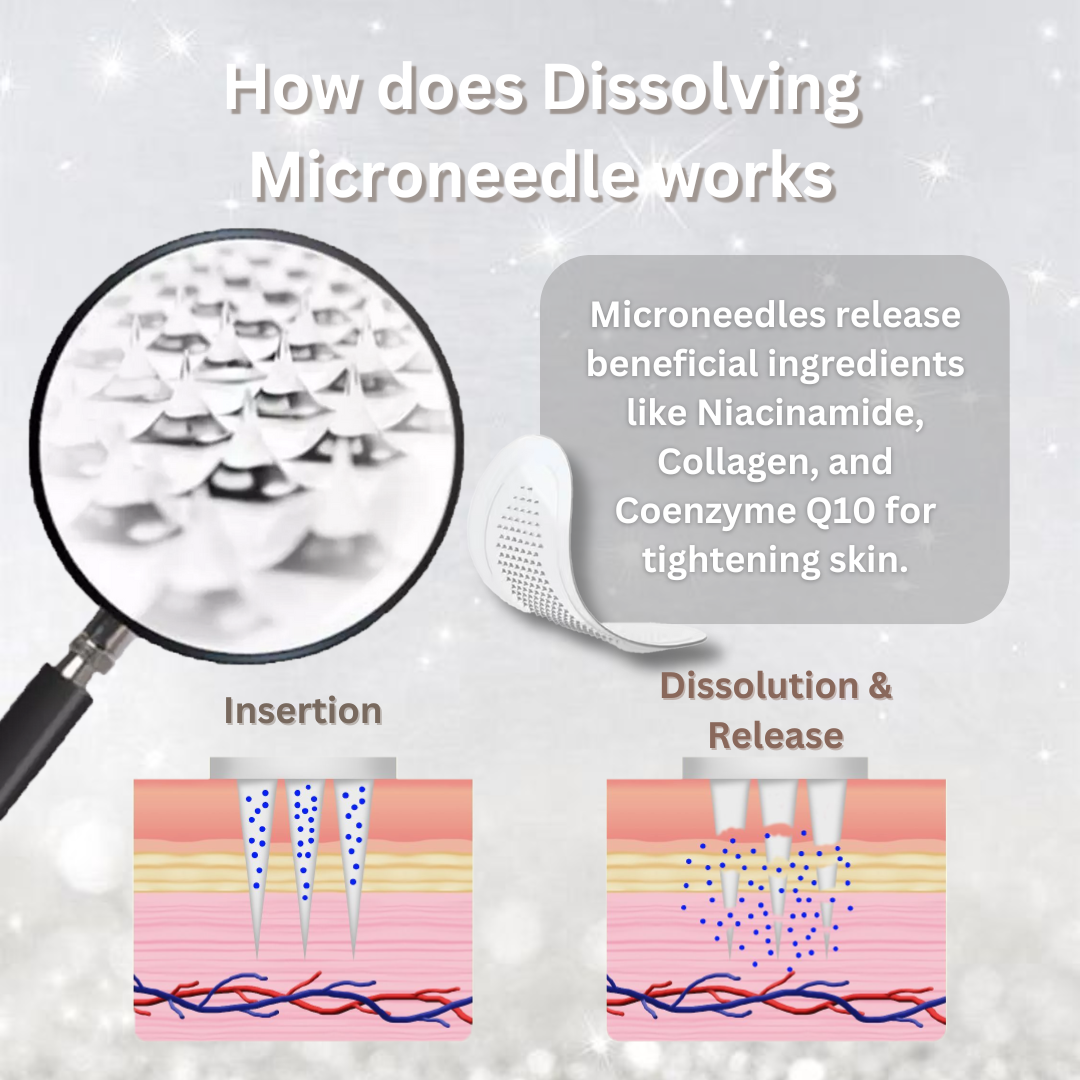Discover the soothing sensation of our meticulously designed patches, engineered for optimal absorption and enriched with potent ingredients. Notice the gentle, precise sensation of the micro-needles as they delicately stimulate your skin. Experience a subtle tingling upon application, as our advanced microneedling technology facilitates the infusion of beneficial components, unveiling a luminous and revitalized complexion.