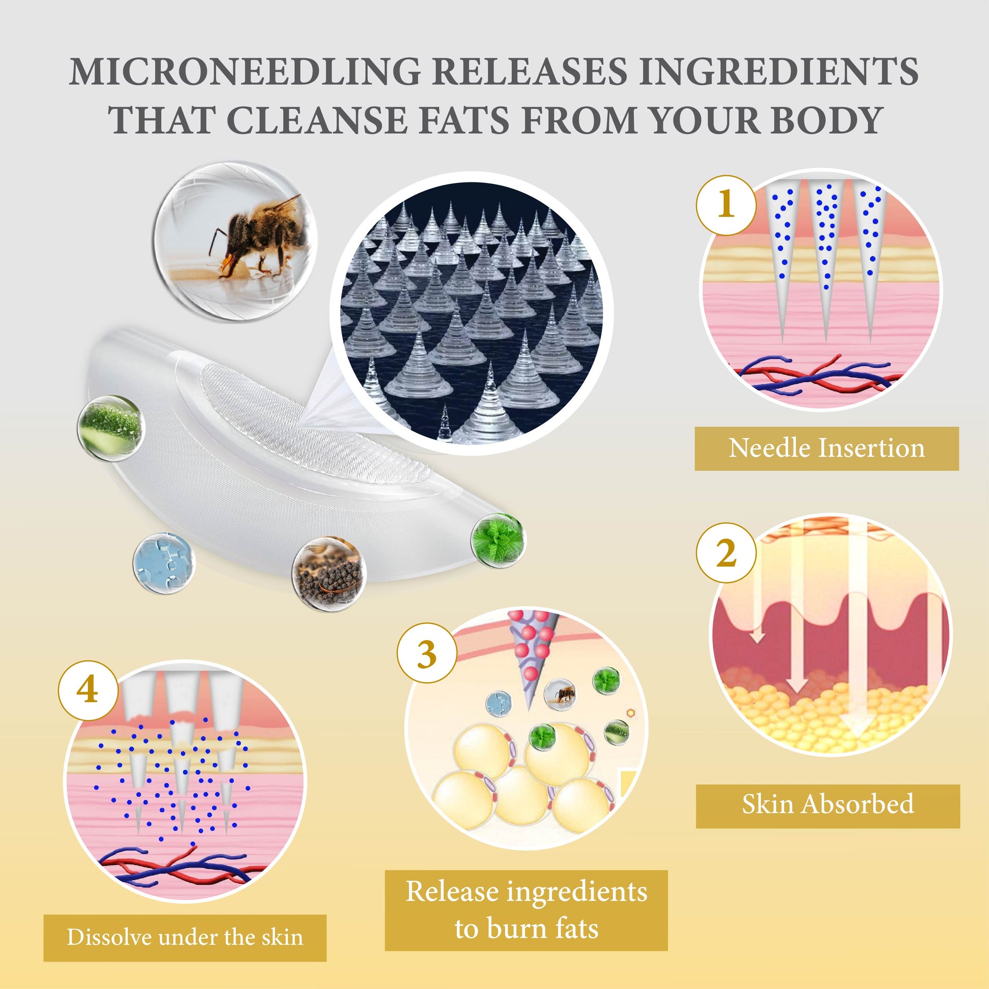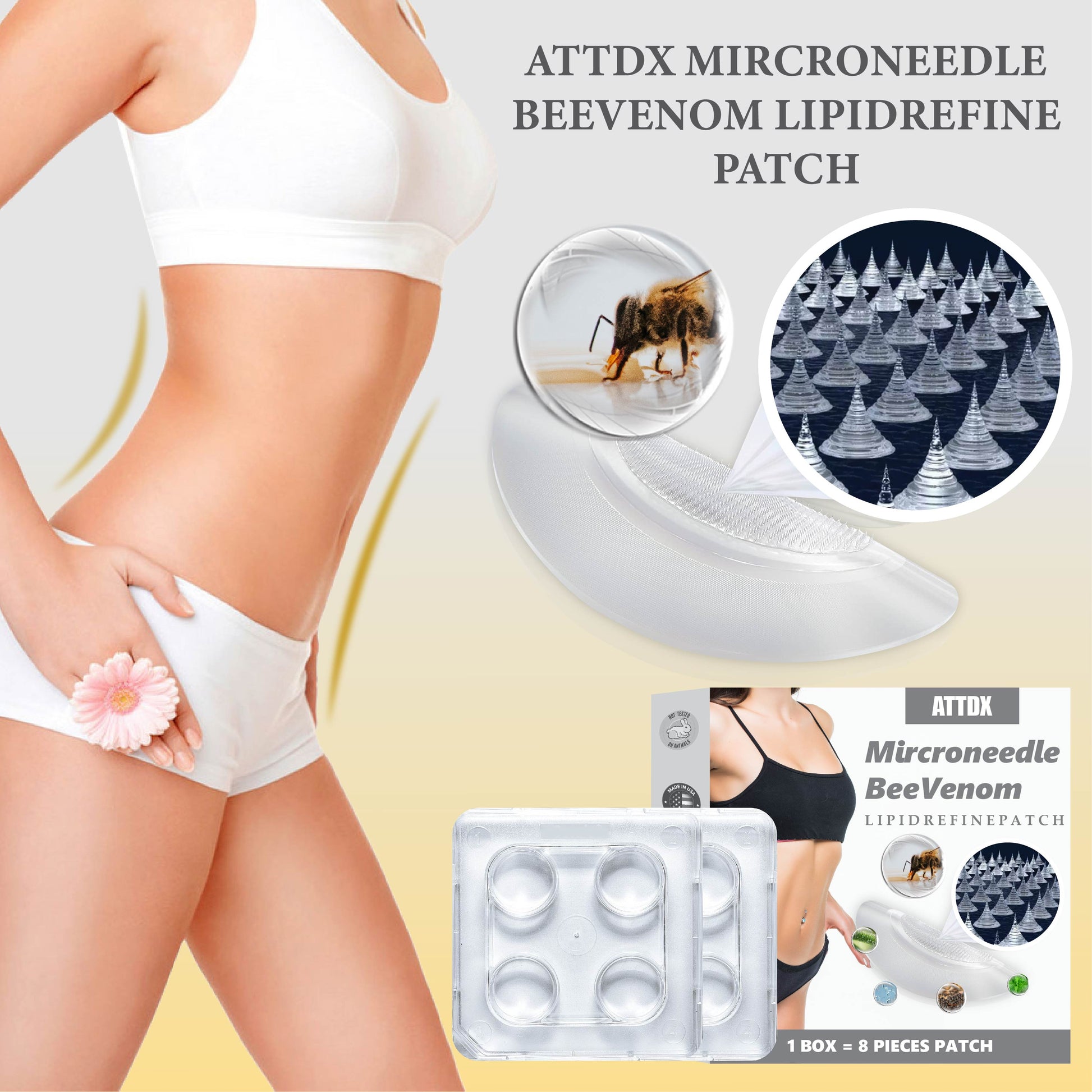 ATTDX Microneedle BeeVenom LipidRefine Patch utilizes innovative microneedling technology to deliver the powerful benefits of Bee Venom directly into the skin, promoting a leaner appearance. This patch features dissolvable microneedles, transforming bee venom and other ingredients into 200-micron microneedles, with a total of 1,100 microneedles working effectively. By creating tiny micro-channels, the patch enhances absorption and activates your bodyâs natural processes to reduce unwanted cell growth. This unique formulation not only helps sculpt and tone your figure but also leaves you feeling more confident and revitalized as you witness noticeable improvements in your waistline and overall appearance.