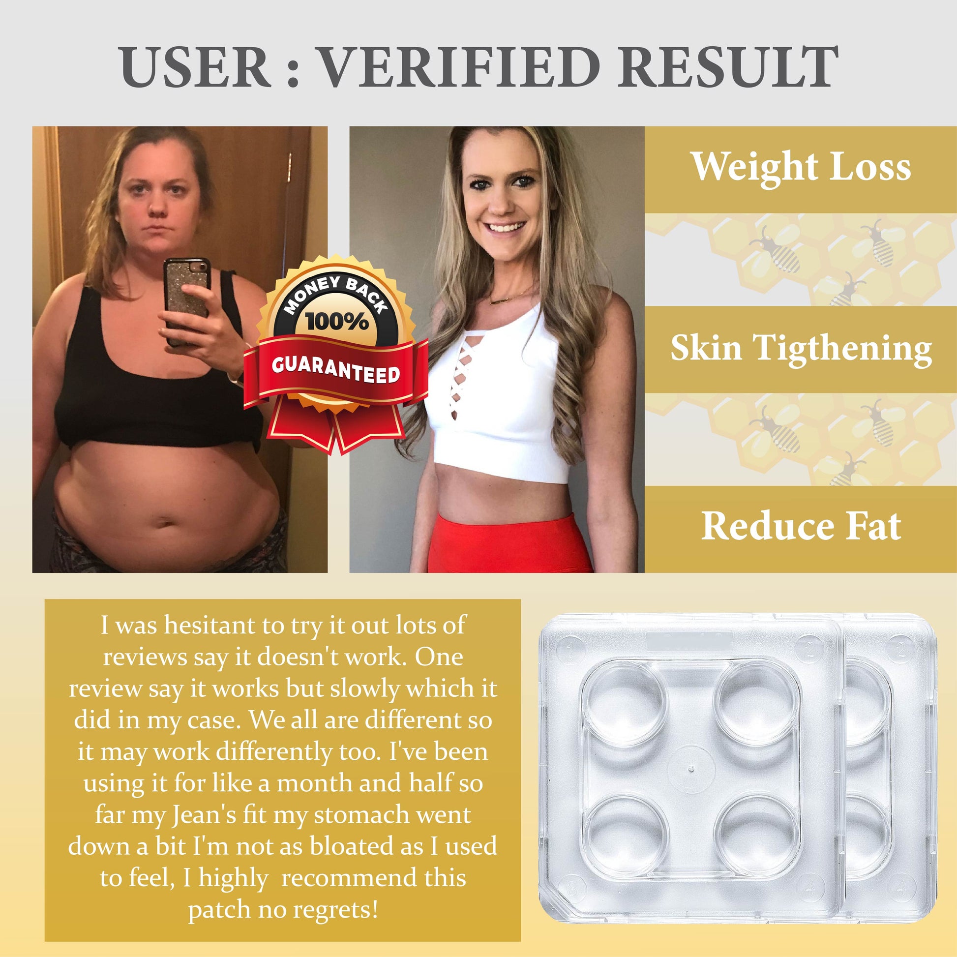 Iâm so excited about the results! My body feels firmer and more toned. It's incredible how this patch has helped me achieve a slimmer silhouette and improved my confidence.â - Samantha Taylor, 32, Boston, MA âââââ
