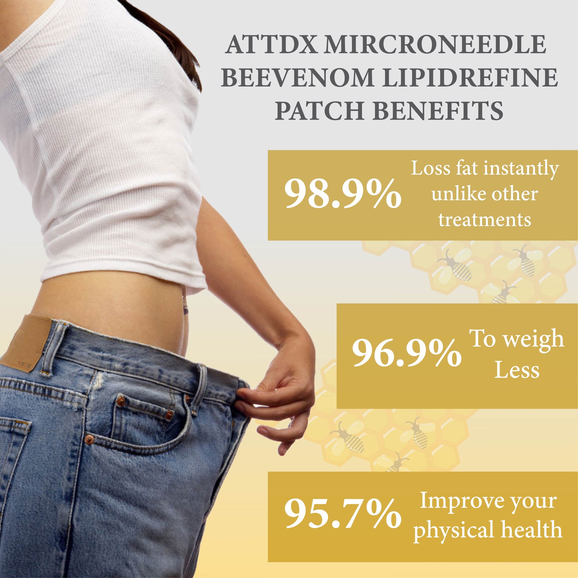 At ATTDX, we empower your transformation with nature's finest ingredients for a healthier and more confident you. With ATTDX Microneedle BeeVenom LipidRefine Patch, experience the transformative power of Bee Venom for a more sculpted appearance. This innovative patch delivers active ingredients directly to the skin, promoting firmness and enhancing your overall body contours.