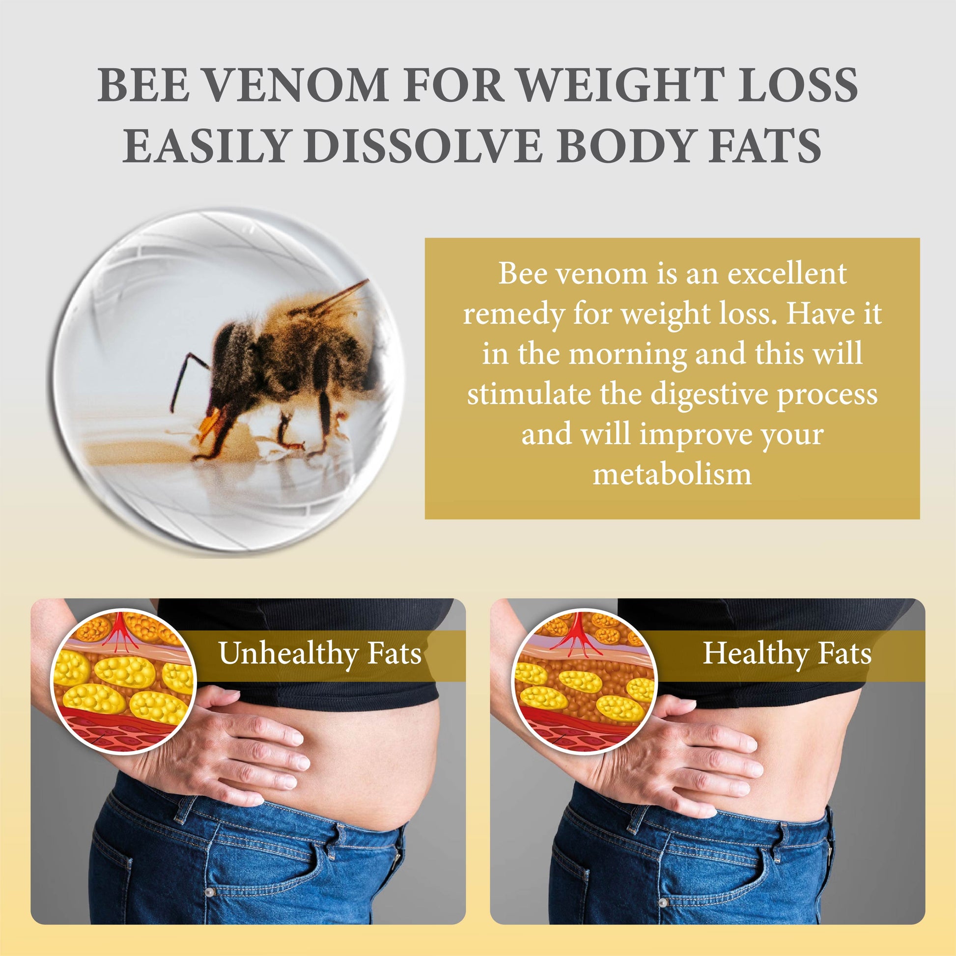 Bee Venom Peptide helps inhibit the growth of unwanted cells, promoting a healthier body composition. Its unique properties support natural contouring and enhance overall skin firmness.