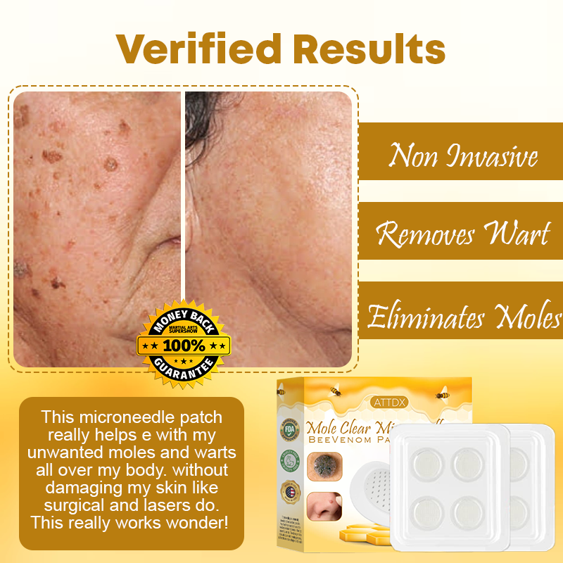 I recently started using the ATTDX MoleClear Microneedle BeeVenom Patch, and Iâm amazed by the results. After just two weeks, my warts completely disappeared, thanks to the powerful anti-inflammatory properties of bee venom that reduced swelling and redness. The best part is that the microneedles donât hurt at all, making the treatment incredibly comfortable. Not only did the patch promote healthy skin regeneration, but it also helped prevent future occurrences, leaving my skin feeling rejuvenated and clear.