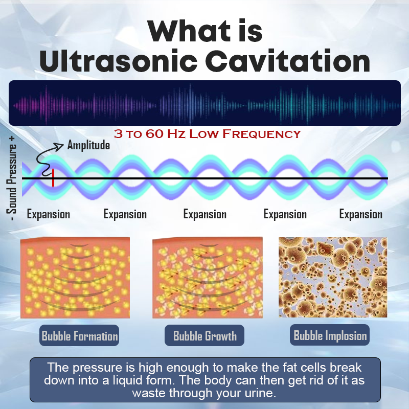 When sound waves propagate into the bodily fluids, the pressure changes of the sound waves cause tiny bubbles to form in the liquid. These bubbles rapidly expand and contract under the pressure of the sound waves, ultimately generating high temperatures and pressures, thus producing energy to promote the breakdown and metabolism of fat cells, reduce fat deposits, as well as improve skin firmness.