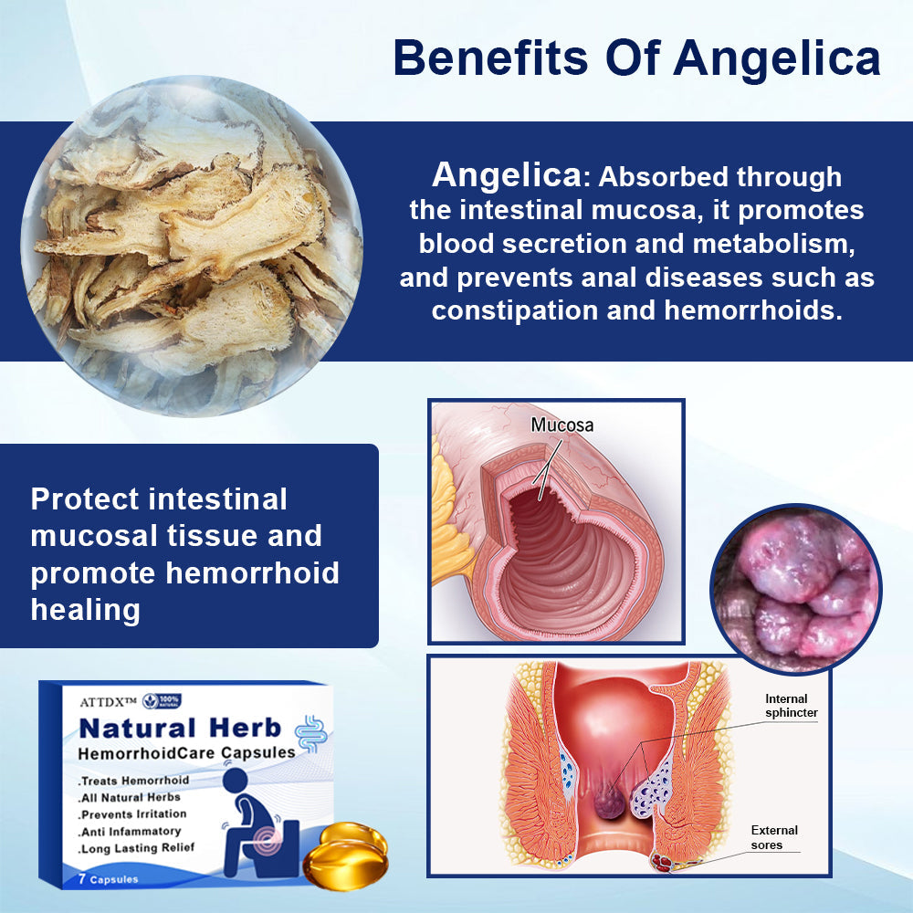 ATTDX™ Natural Herb HemorrhoidCare Capsules utilize Angelica sinensis, renowned for its remarkable capacity to improve blood circulation and reduce inflammation. When placed in the rectal area, these capsules help alleviate bleeding and discomfort linked to hemorrhoids while promoting healing. Angelica sinensis also facilitates detoxification, aiding in bodily cleansing and supporting a healthier body composition, thereby providing a thorough solution for hemorrhoid relief and overall wellness.