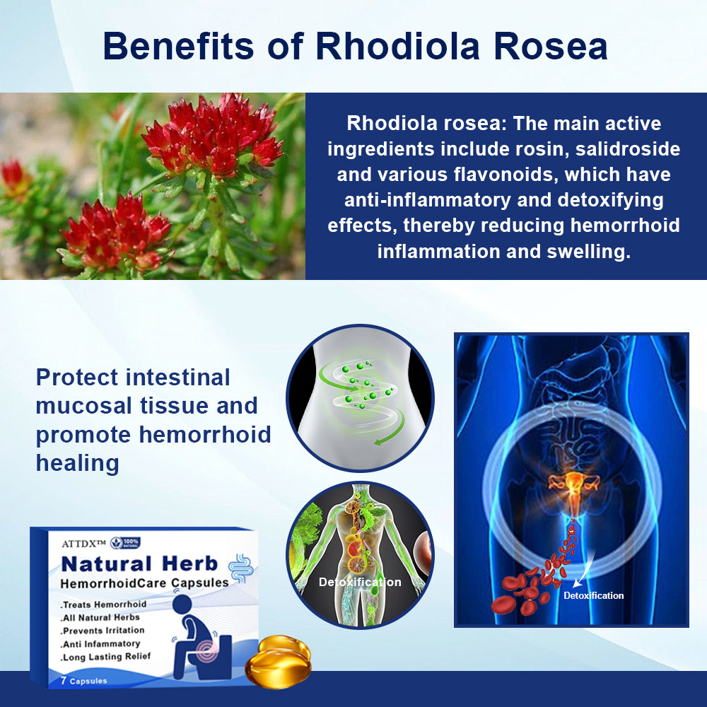 ATTDX™ Natural Herb HemorrhoidCare Capsules leverage the power of Rhodiola Rosea, a herb known for its remarkable detoxification properties. Rhodiola Rosea helps the body efficiently eliminate toxins and supports liver function which is crucial for maintaining a healthy metabolism and effective weight management. By enhancing the body's natural cleansing processes, it reduces bloating and improves overall digestive health. This dual-action approach not only alleviates hemorrhoid symptoms but also assists in achieving a balanced weight, offering a comprehensive solution for both relief and wellness.