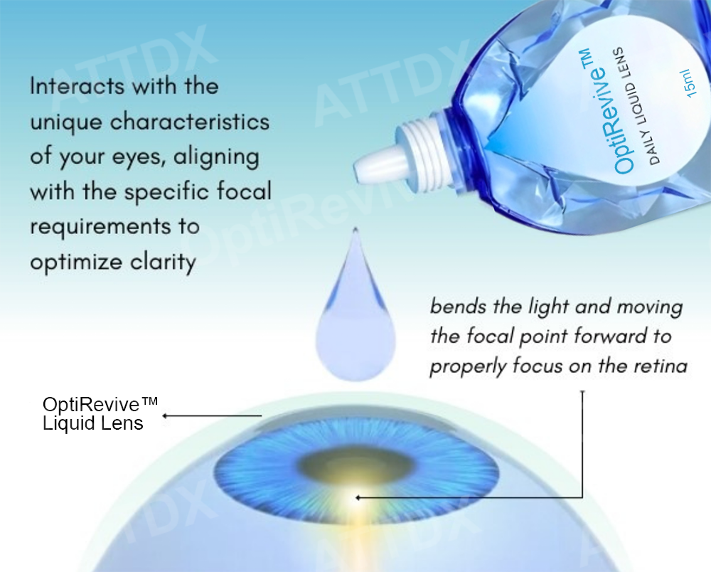 The OptiRevive™ Daily Liquid Lens operates on a cutting-edge principle where the liquid swiftly adjusts to the natural focal point of your eyes. This dynamic adaptation is the key to correcting refractive errors, such as nearsightedness or farsightedness, seamlessly. When you apply 1-2 drops of the liquid, it intelligently interacts with the unique characteristics of your eyes, aligning with the specific focal requirements to optimize clarity.