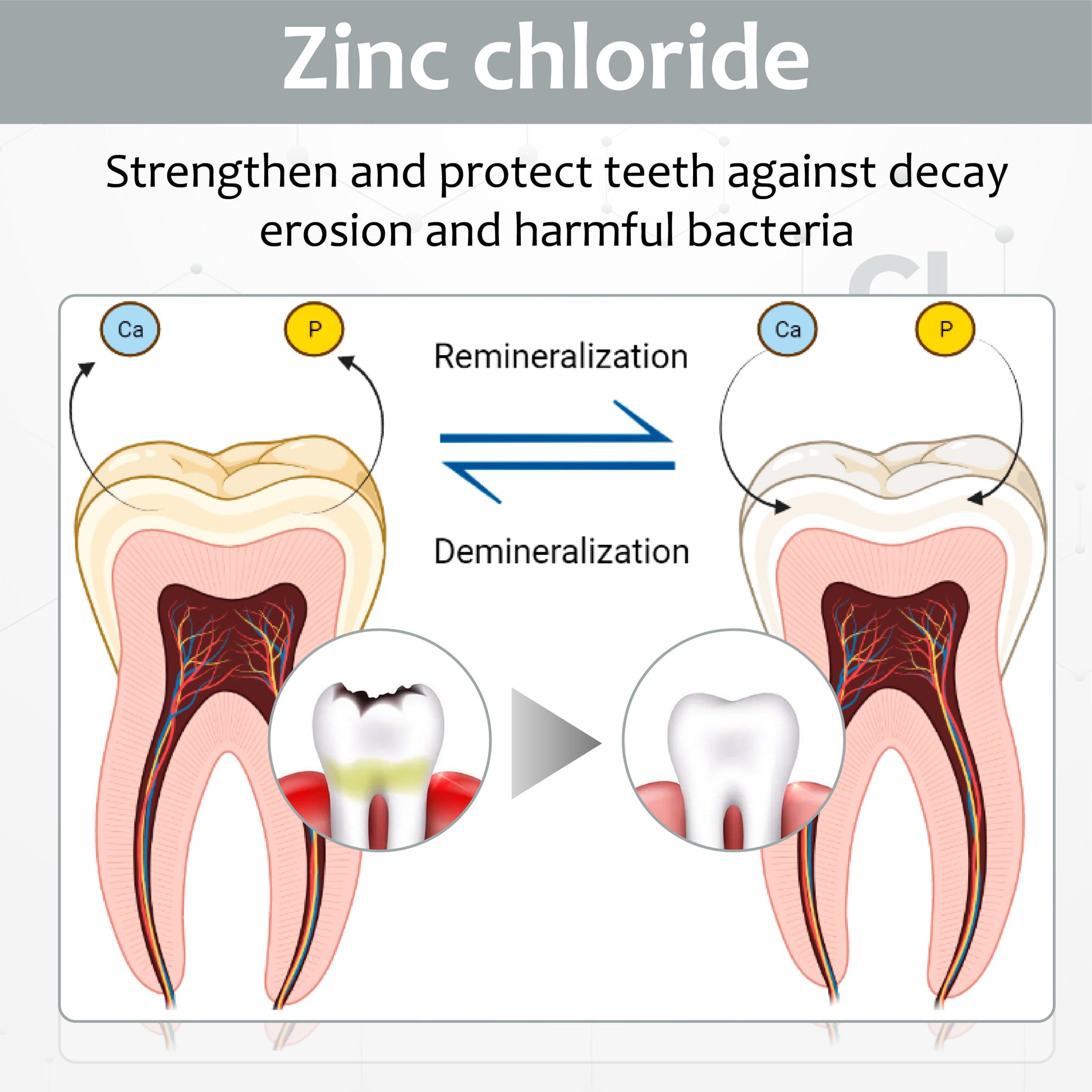 Zinc chloride: Zinc chloride effectively neutralizes volatile sulfur compounds responsible for bad breath, thereby maintaining oral freshness by reducing their levels in the mouth. It supports tooth enamel remineralization, enhancing dental strength and protection against decay and erosion.