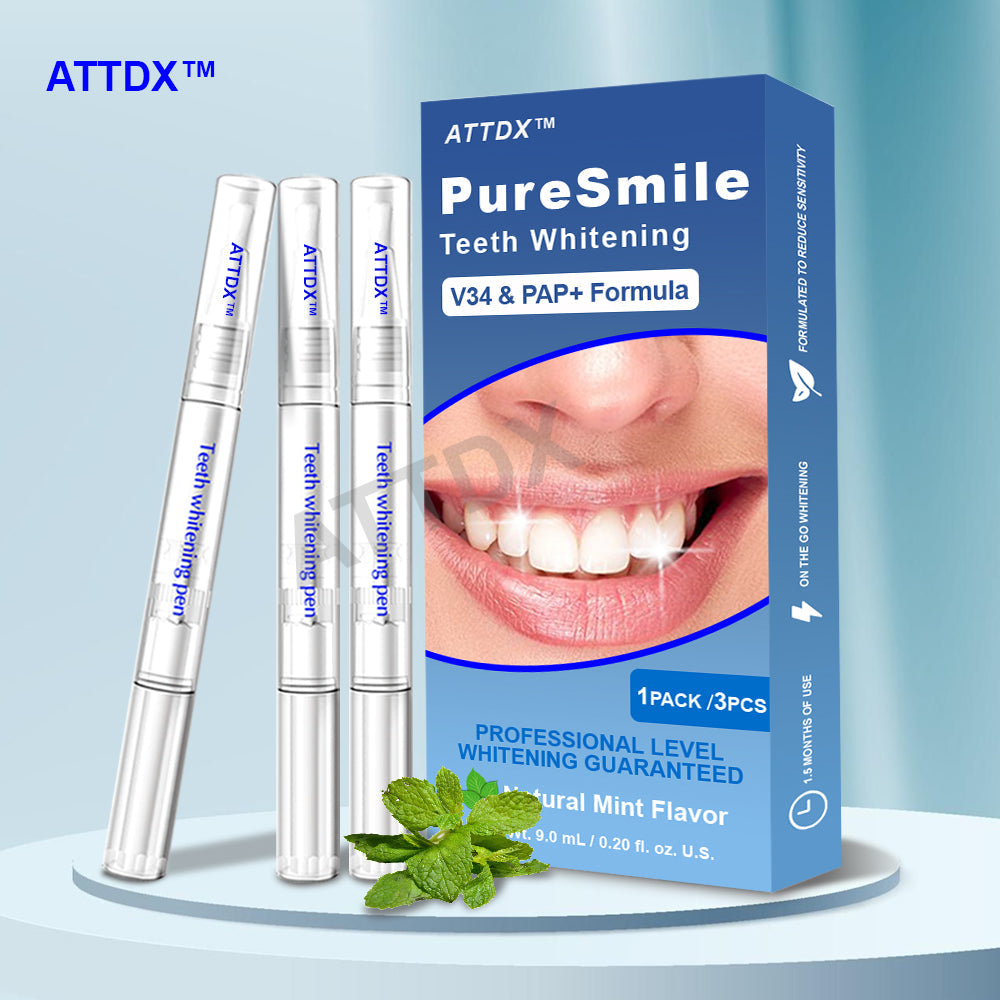 At ATTDX, we deliver instant whitening with precise application, ensuring enamel-friendly care and a brighter smile with every use. Our ATTDX™ PureSmile Teeth Whitening Pen offers a convenient and effective solution for achieving a brighter smile. With its precise applicator and gentle formula, it effortlessly removes stains while protecting your enamel.